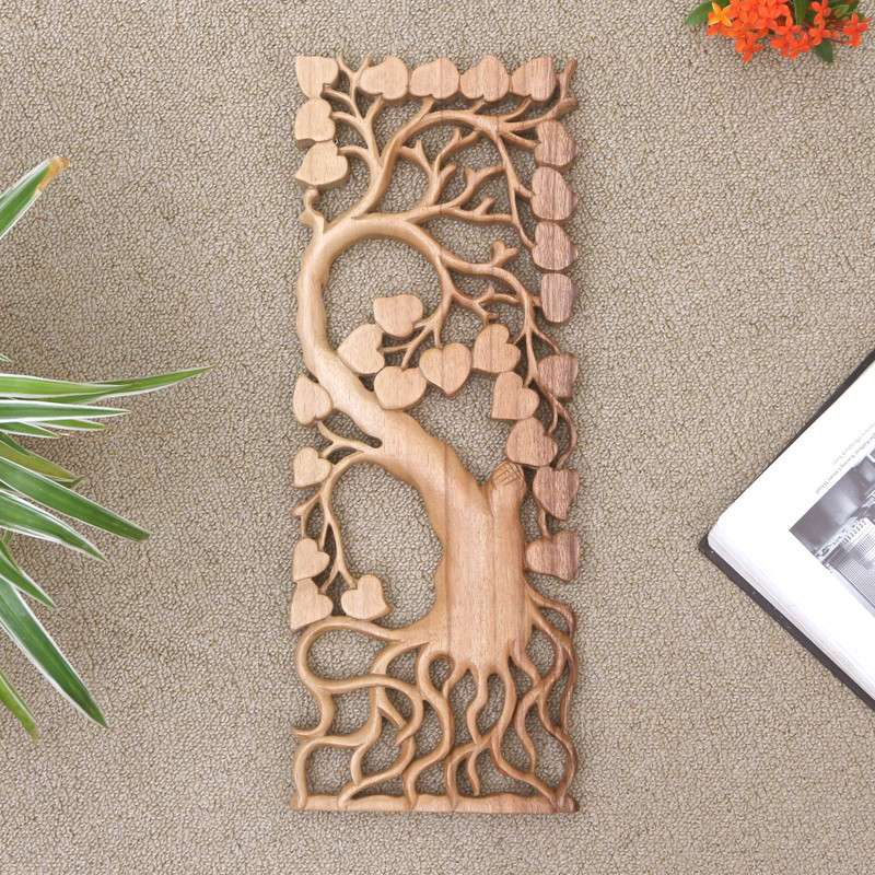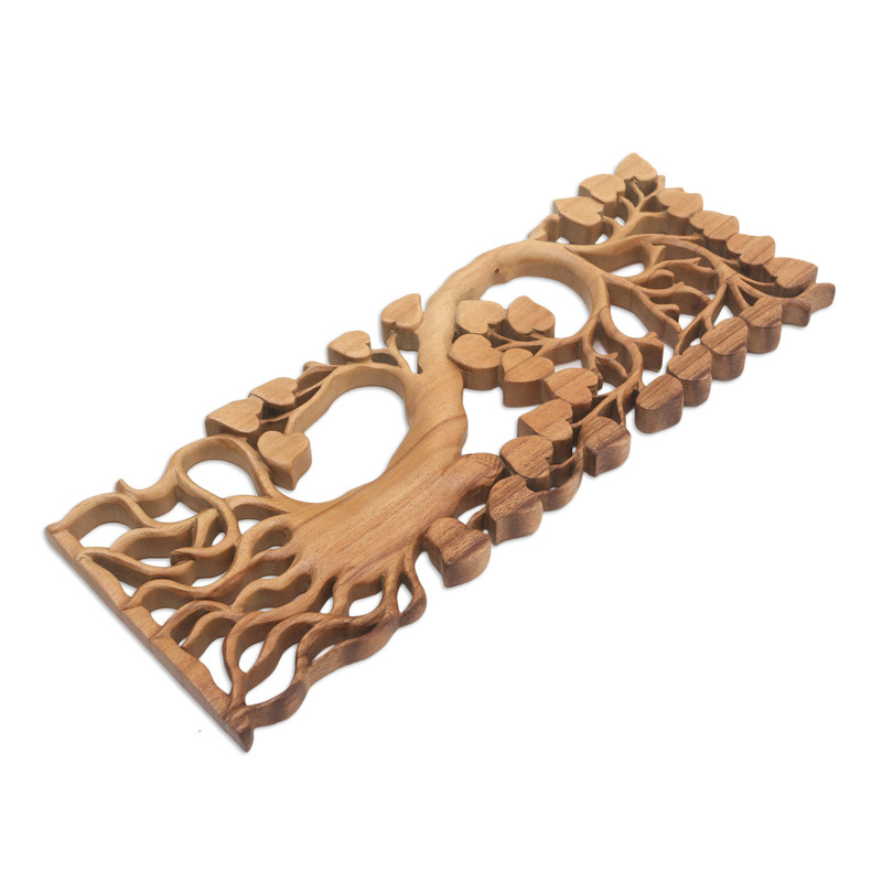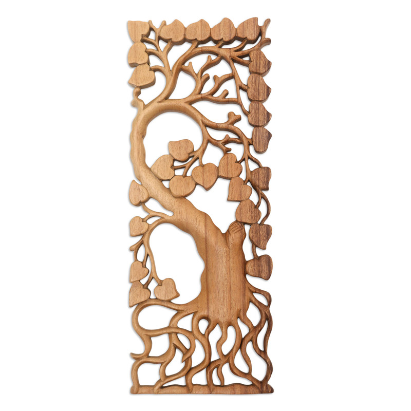 Hibiscus, known locally as kembang sepatu, is a tree ubiquitous to Bali and the inspiration for this gorgeous relief panel by Indonesian artisan Made Mulyani. Crafted from local suar wood, the wall art celebrates the entire tree in all its natural beauty, from swirling roots to leafy branches.