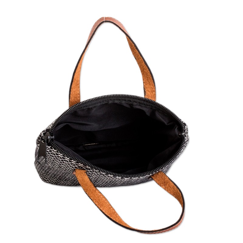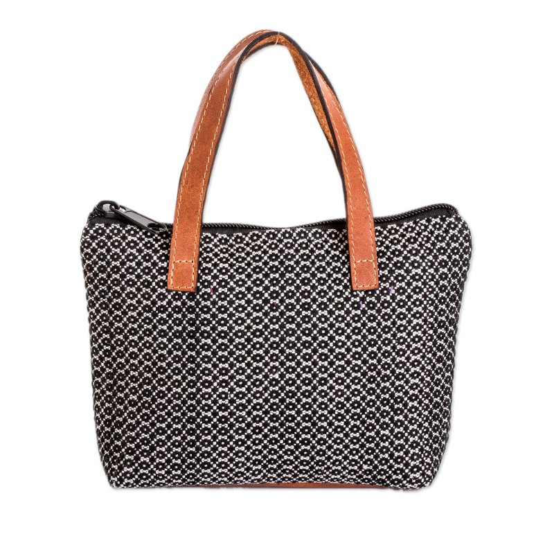 Complement your ensembles and adventures with a dapper accessory displaying Guatemala's high-quality textile artistry. Handwoven with talent by artisans from the Life and Hope Women's Association, this cotton handbag features a gorgeous combination of onyx and white hues arranged in a refined geometric pattern, exuding luxury. The design is accented with leather straps, all secured by a handy zipper closure.