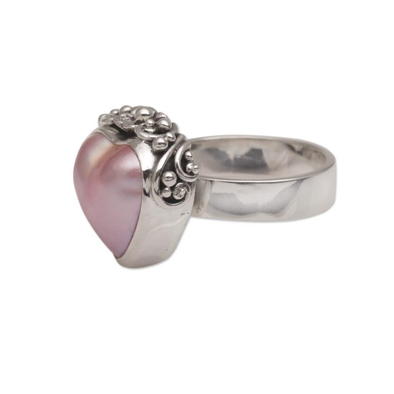 Backed by our 100% Happiness GuaranteeBuana has encapsulated the soft thump of a heart in love in this beautiful cocktail ring. The Balinese artisan expertly crafts a pink cultured pearl into a heart shape and sets it in a sterling silver setting of vine-motifs with a jepun, or frangipani flower resting above.