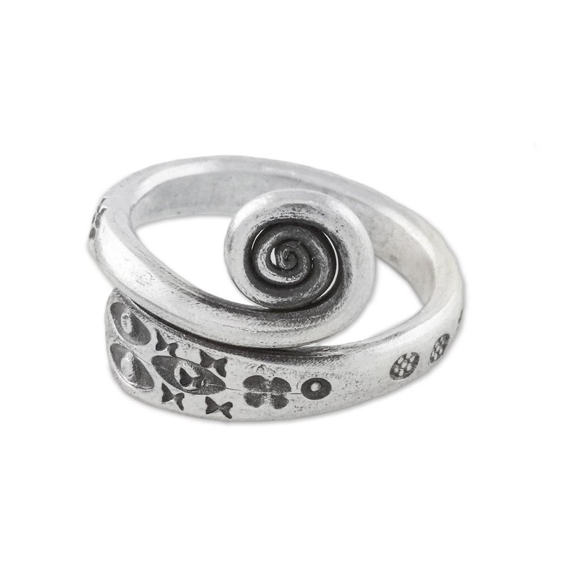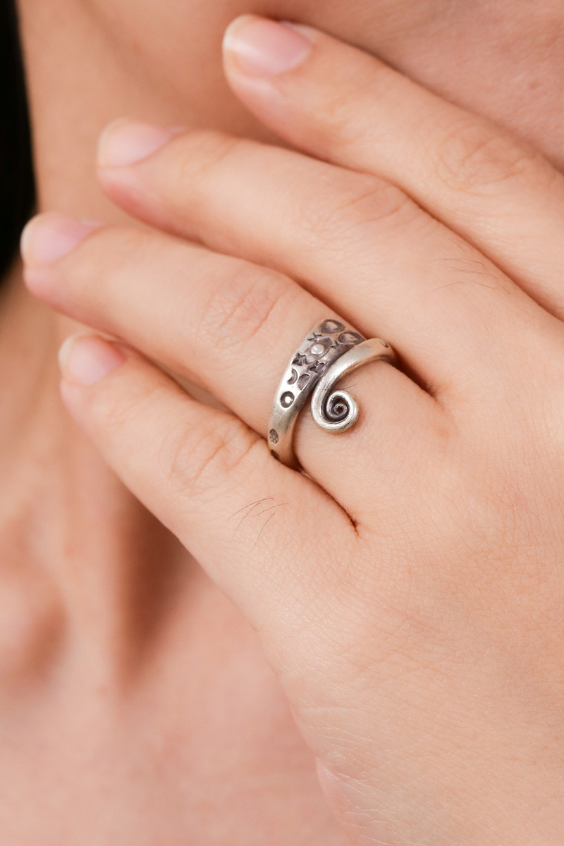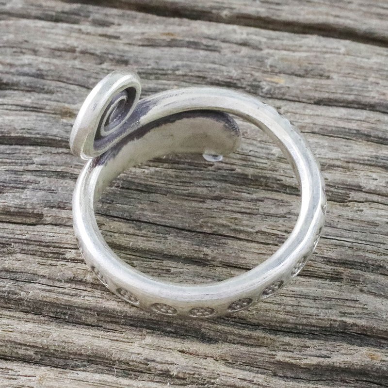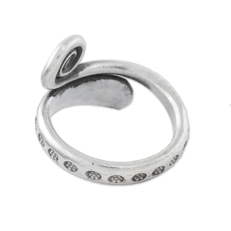 Backed by our 100% Happiness GuaranteeLook deep in to your third eye with this unique, hand crafted wrap ring from Thai artisan Achara. This ring's design features an abstract stamping of eye shapes on the crown and floral patterns around the band. The 925 sterling silver band then culminates in to a beautiful, oxidized spiral at the crown.