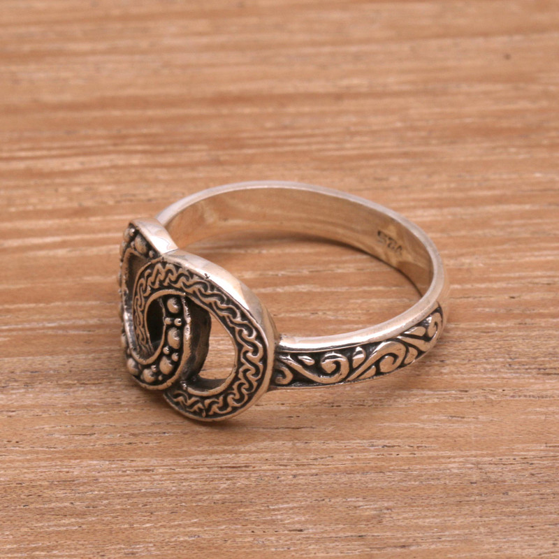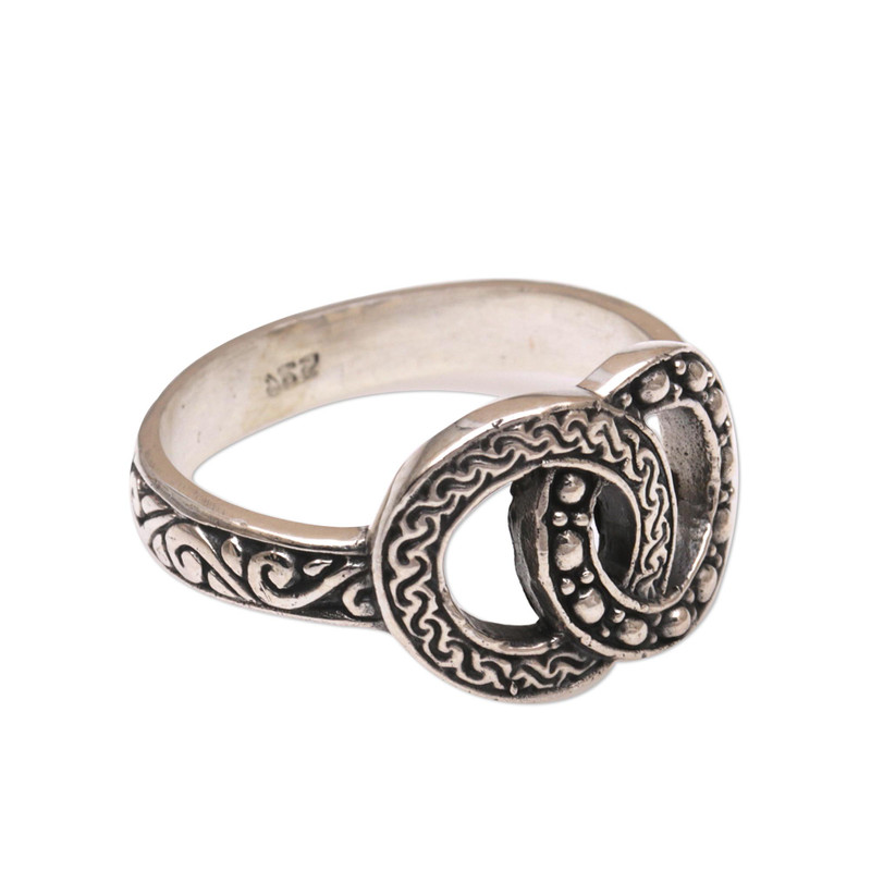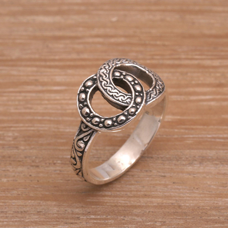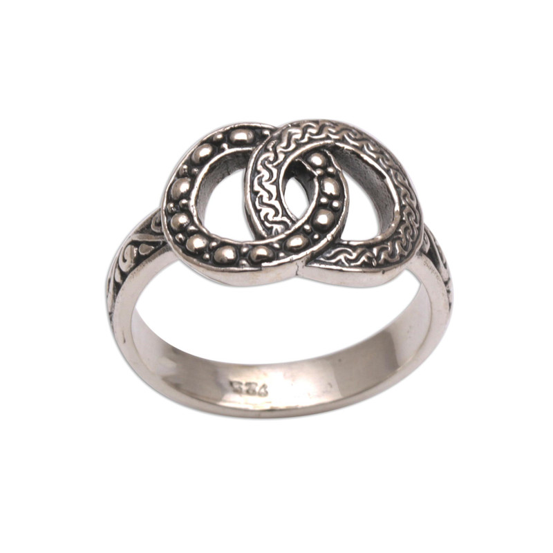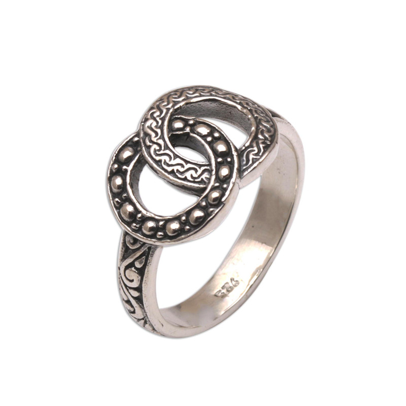 Interlocking circles of 925 sterling silver represent the infinity symbol in this ring by Dewa Arimbawa in Bali. The first written record of the infinity symbol goes back thousands of years, and it was developed as a philosophical concept representing limitless possibilities and boundless time. Two different motifs suggest the harmonious union of independent ideas.