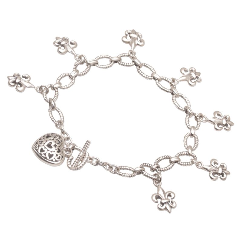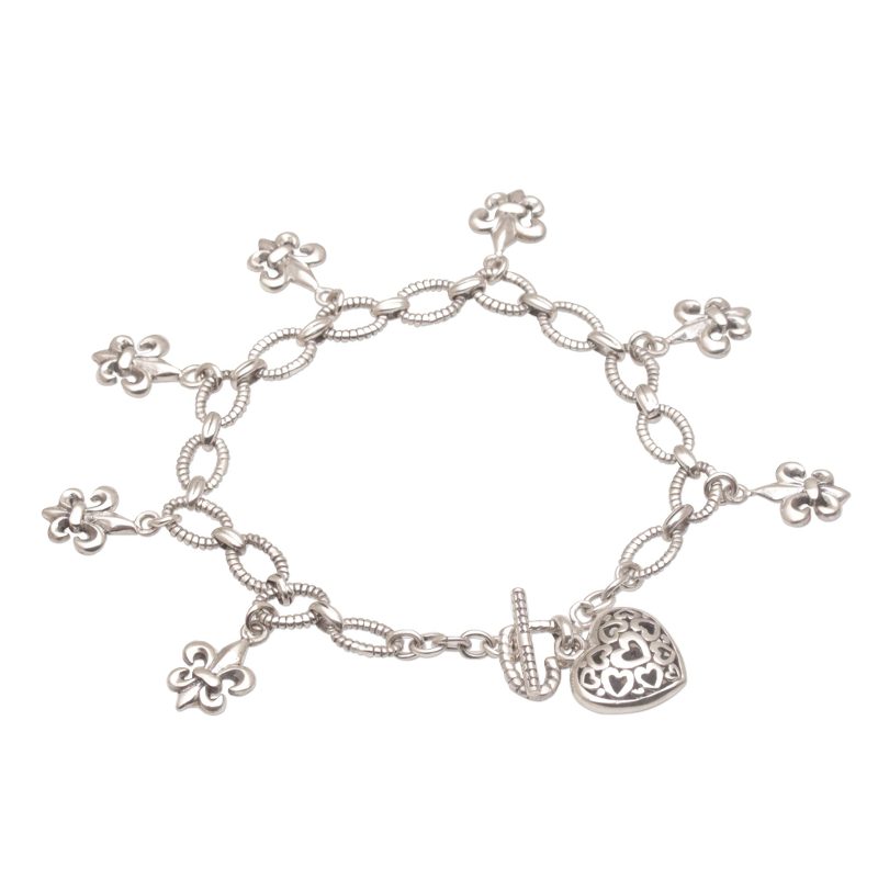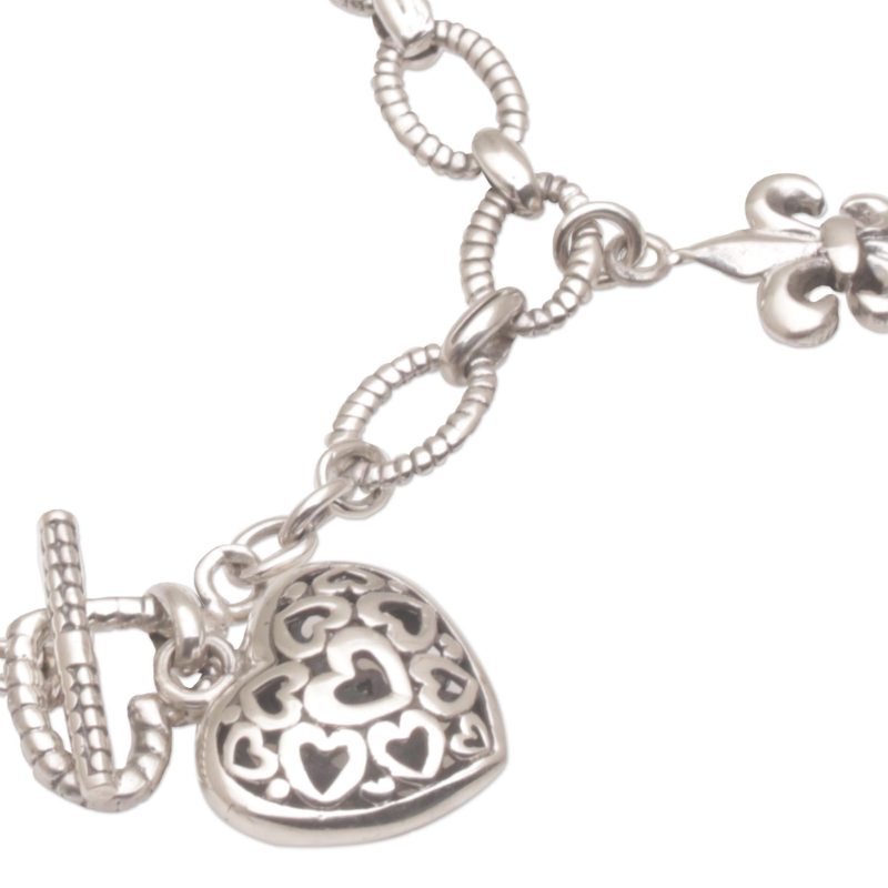 This beautiful bracelet chain of interlocking 925 sterling silver is presented by Putu Putri of Indonesia. A series of fleur-de-lis style charms dangle and accentuate the chain, while an impeccably rendered heart-shaped charm, with tiny heart motifs inside, adorns the end of the bracelet next to the toggle clasp closure.