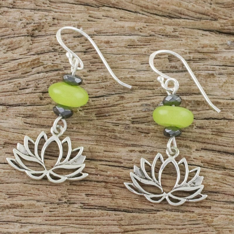 Backed by our 100% Happiness GuaranteeThai artisan Tipa handcrafts these lovely dangle earrings from bright sterling silver. Beneath green agate and hematite beads, a lotus flower gives each earring an air of exotic elegance.