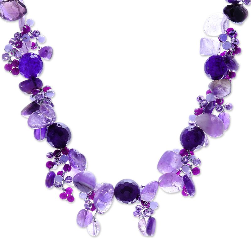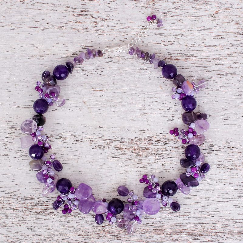 Backed by our 100% Happiness GuaranteeGet lost in a beautiful daydream with Nareerat's rich purple necklace. The Thai artisan hand knots silk thread around faceted quartz and amethyst chips and beads to create a cluster of gorgeous purple-hued gems. A sterling silver-plated brass lobster claw clasp finishes the necklace with a touch of cool shine.