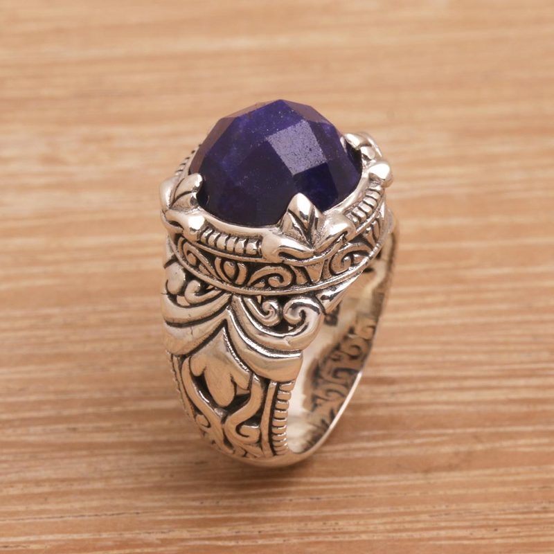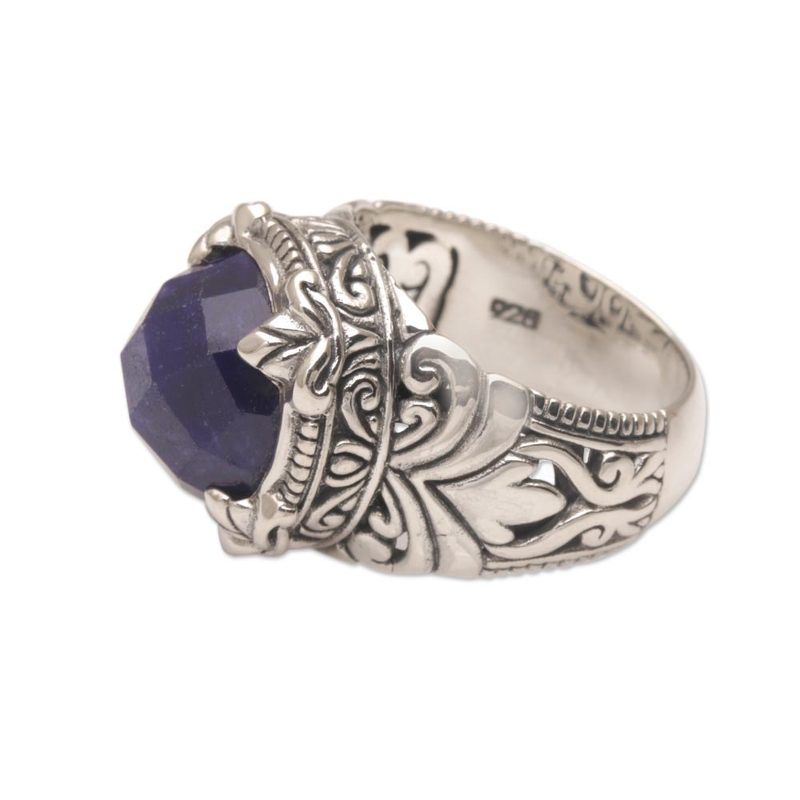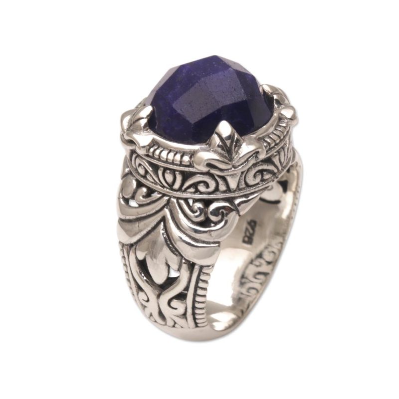 Over five carats of sapphire shimmer in this gorgeous cocktail ring from Balinese designer Lenny. Local artisans hand craft the ring from sterling silver, with intricate vine detailing around the crown and band that accentuate the elegance of the design.