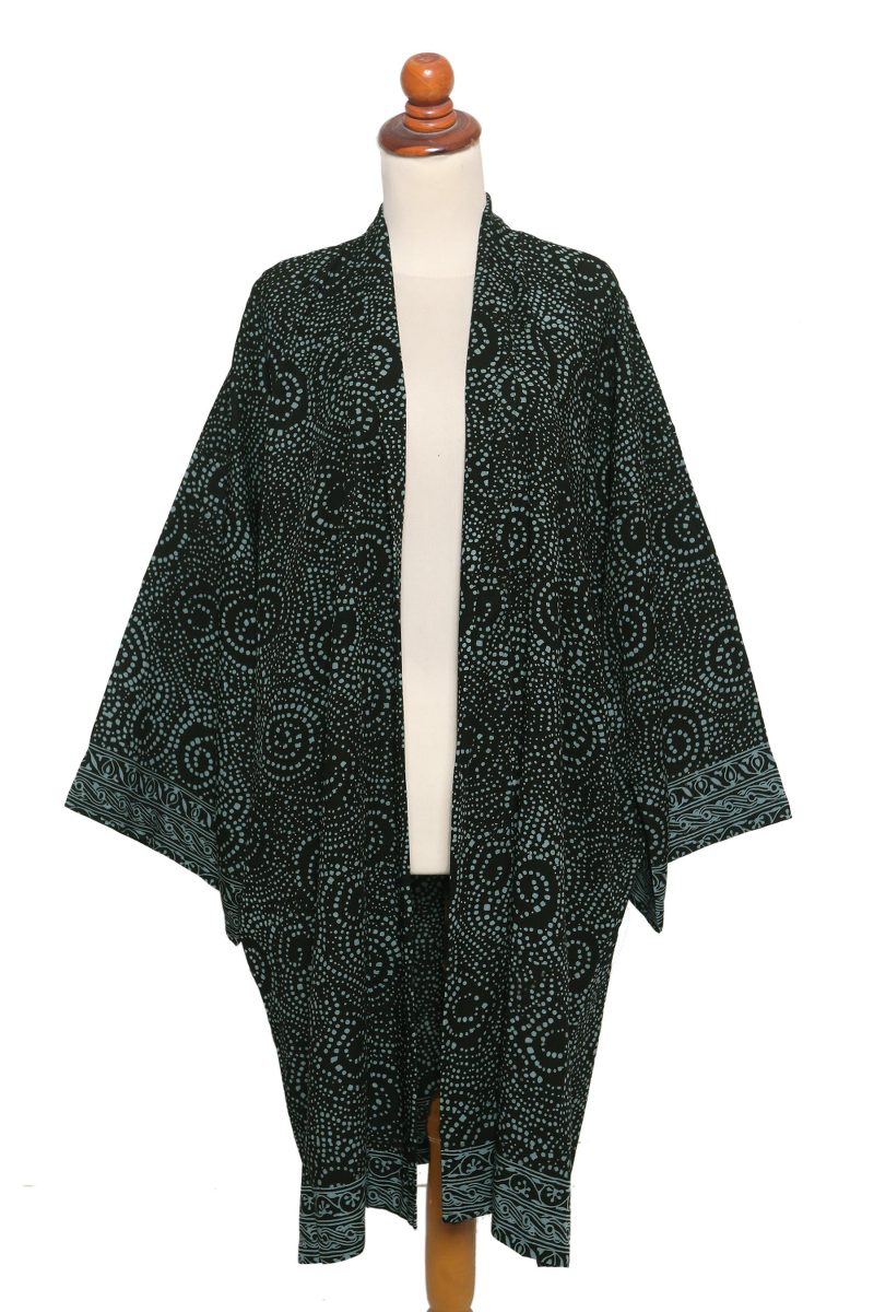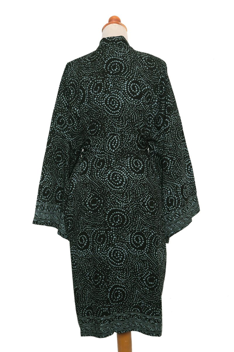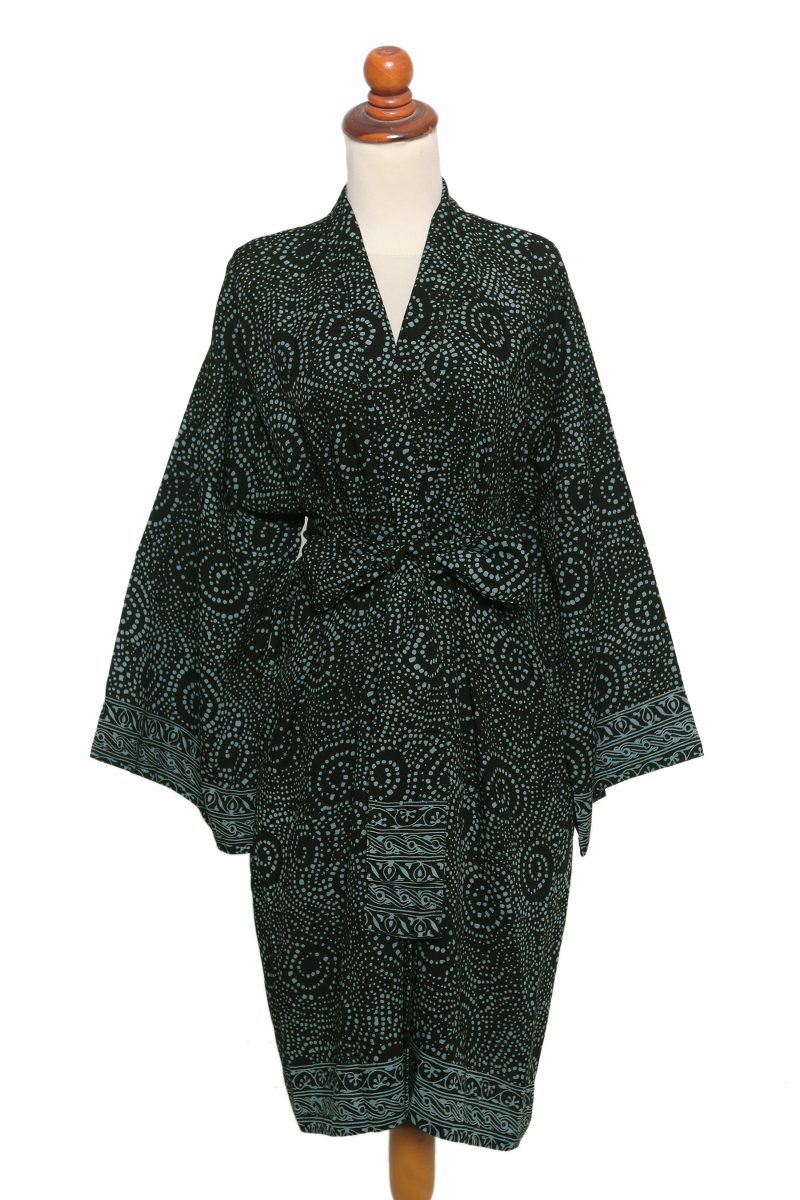 Backed by our 100% Happiness GuaranteeThis elegant robe designed by Balinese artisan Saktut Raitawati is a practical and stylish alternative to a dressing gown or bathrobe. Crafted from fine rayon and featuring a swirling light azure motif stamped on a coal black background, the robe comes with a matching waist belt and includes one pocket on each side.