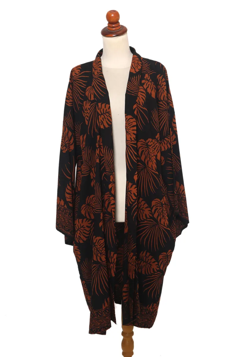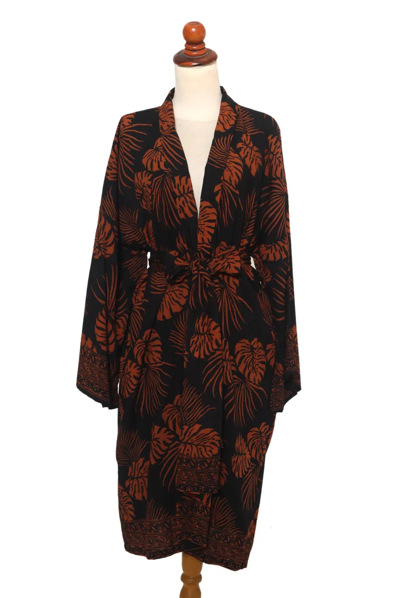 Backed by our 100% Happiness GuaranteeThis elegant robe designed by Balinese artisan Saktut Raitawati features a copper monstera leaf motif stamped on a black base. Featuring a matching waist belt and one pocket on each side, this robe is a stylish alternative to a dressing gown or bathrobe.