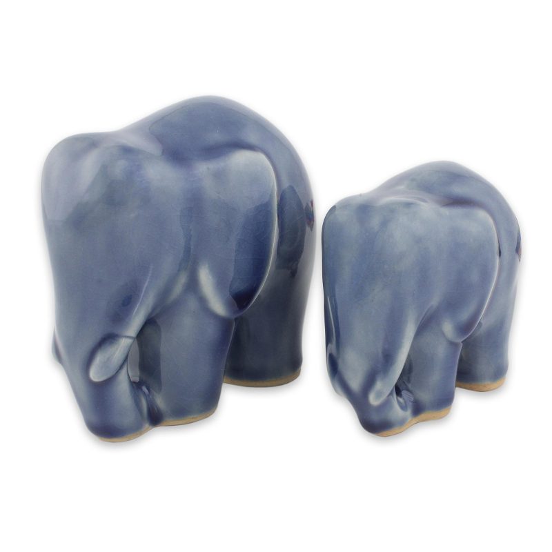 Mama elephant lovingly watches over her calf in this endearing pair of celadon figurines. Duangkamol crafts each ceramic pachyderm with a dark blue crackled glaze, unique to Thailand's millenary celadon art.