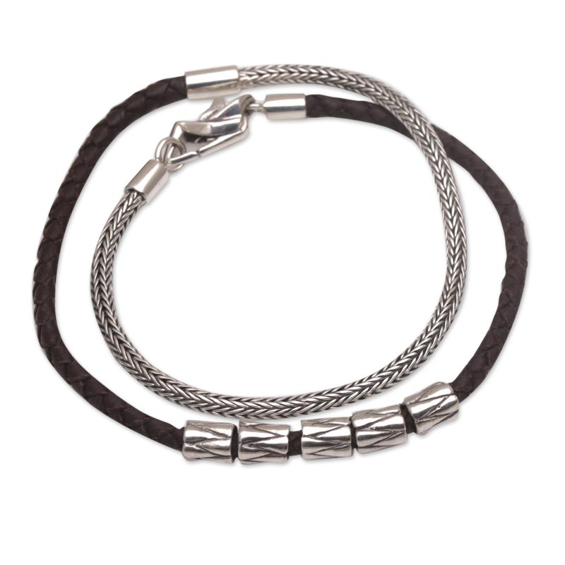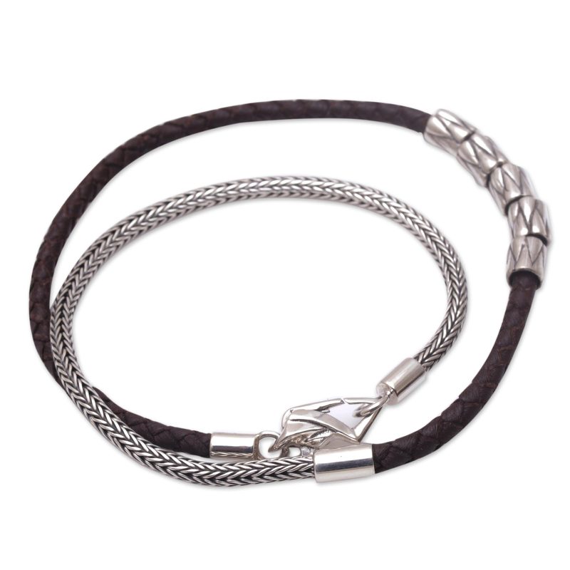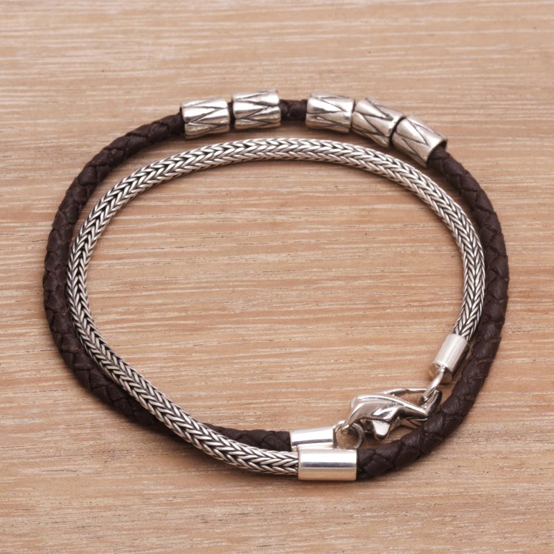 From the workshop of Henry Anthony Sanny in Indonesia comes this intriguing wrap bracelet. Handcrafted from sterling silver and brown leather, the bracelet features braided motifs and silver beads.