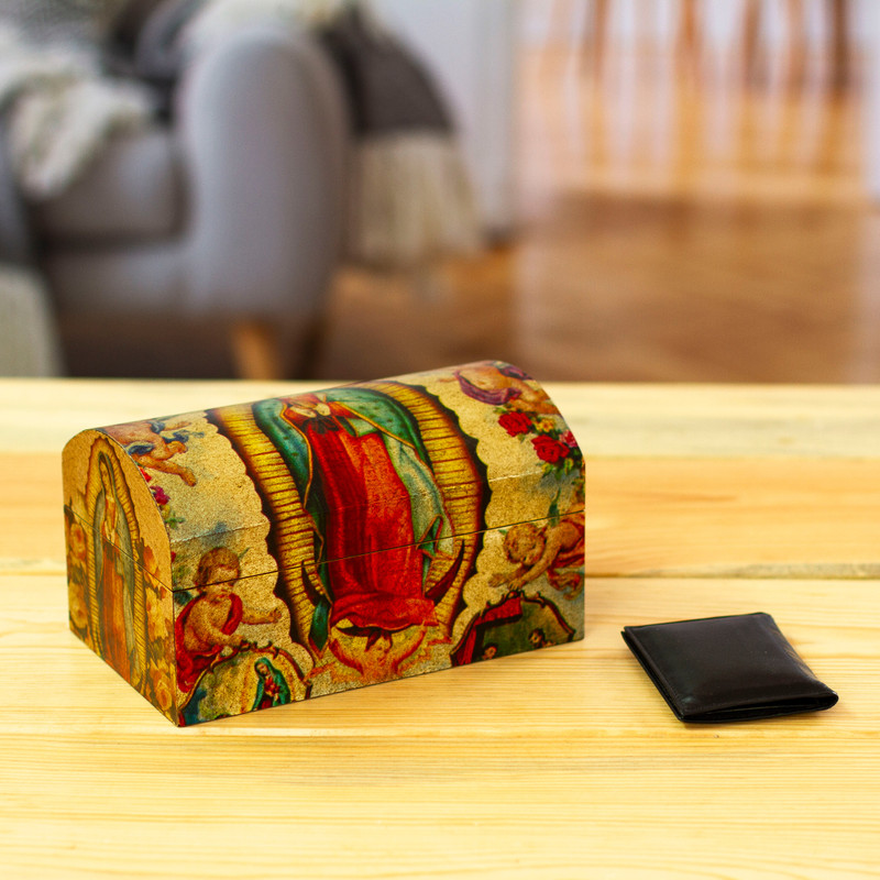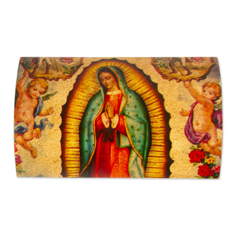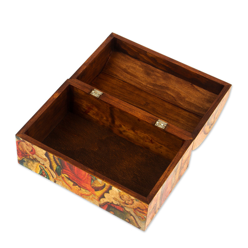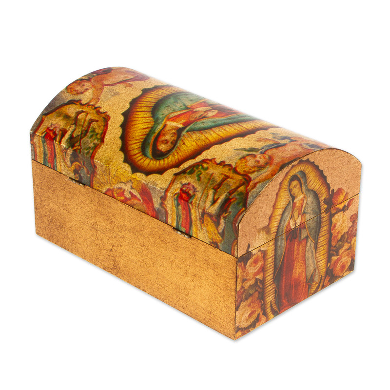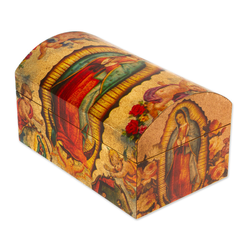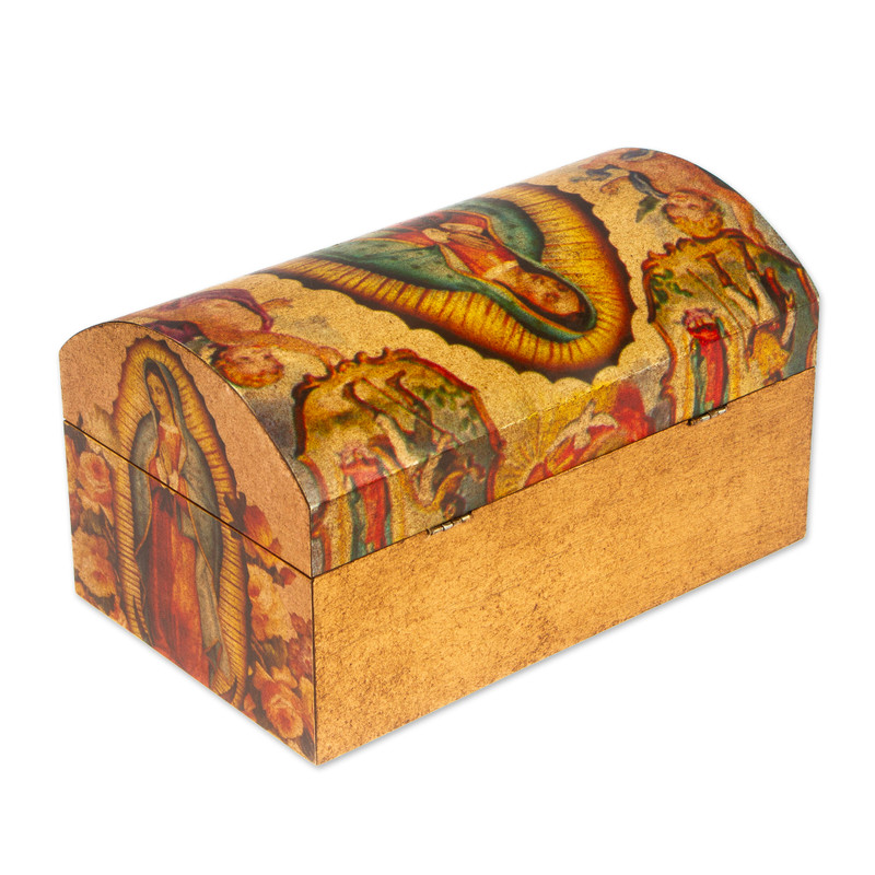 Forever linked to Mexico, the Virgin of Guadalupe is queen of the heavens – she stands on the moon and her cloak holds the stars. She first appeared in 1531 to Juan Diego outside Mexico City and, as proof, caused roses to bloom at the site. Named Patron Saint of the Americas by Pope John Paul II, she is a beloved manifestation of the Catholic faith. Ana Maria González recreates the famous portrait in an antique-style decoupage box with a rustic finish.