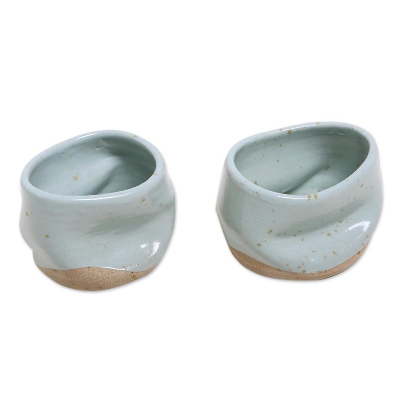 Backed by our 100% Happiness GuaranteeDesigned with a unique shape, Kika's charming pair of cups will take you back to the fun of a childhood art class. The artisan in Java hand crafts the pair from ceramic, carefully shaping the soft material before it's hardened in the kiln. A beautiful turquoise blue glaze provides the finishing touch.