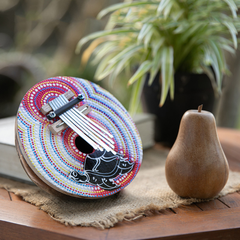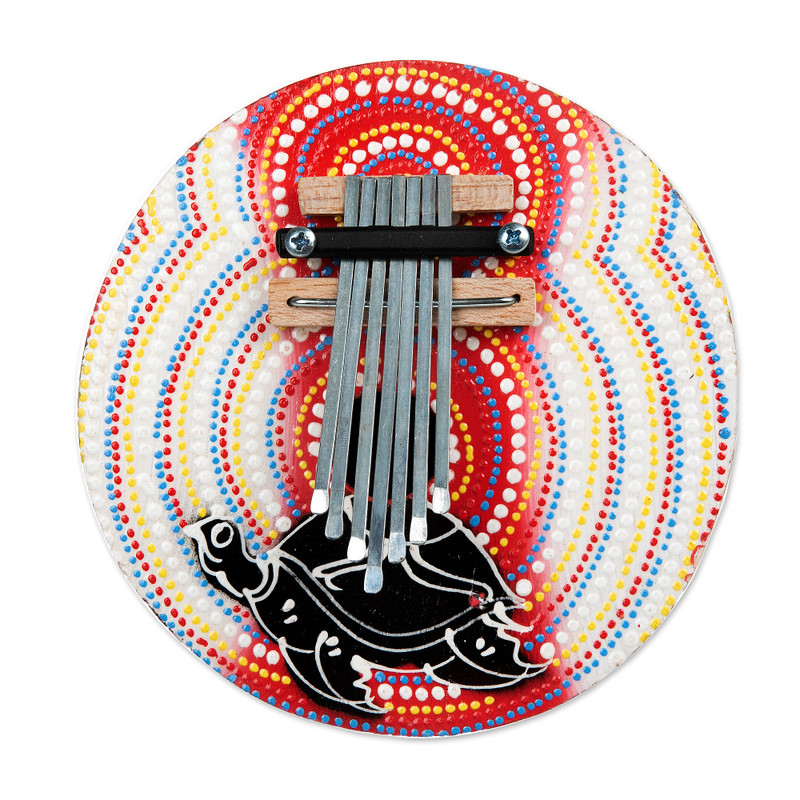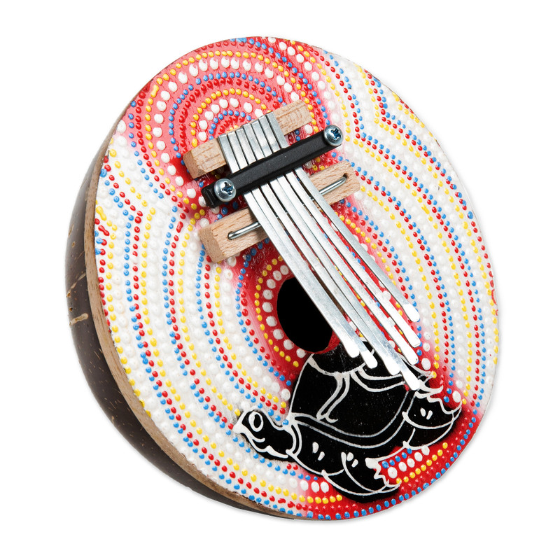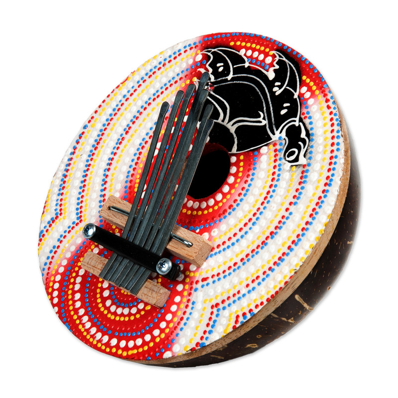 The kalimba, or African thumb piano, is easy to play and pleasing to the ear. Crafted from hollow coconut shell and painted in bright colors, it depicts a sea turtle on the front. The kalimba produces an array of varied tones when the stainless steel "leaves" are plucked with the thumb. This petite and portable instrument is perfect for reproducing elements and tones of tribal music with ease, presented by Trisna Dewi.