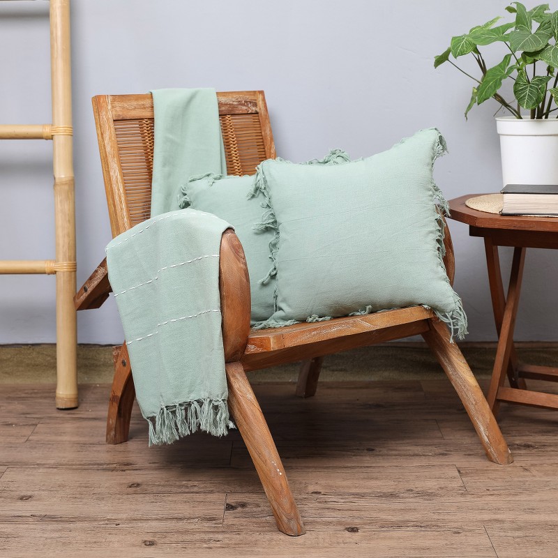 Cozy up in comfort and style with Hifdzur Rahman's three-piece throw and cushion cover set in a delightful olive shade. Expertly handcrafted from cotton in Bali, these lovely accessories feature delicate fringes on the ends while the throw also boasts subtle white stitching accents. Whether you're reading, watching movies or just relaxing, this lovely set creates a warm, welcoming feel.