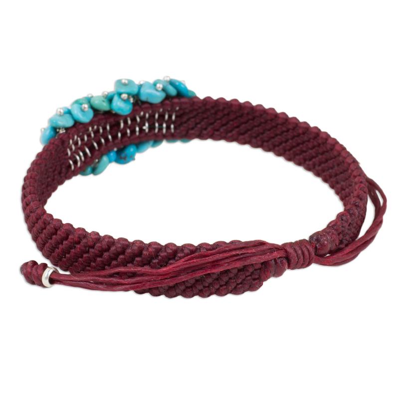 Tiny beads of sterling silver glisten atop reconstituted turquoise gemstones in this hand crafted bracelet presented by Thai artisan Napapat. She hand braids polyester waxed cord dyed a deep red and sets a cluster of gemstones in the center of this unique beaded bracelet. This piece is inspired by the work of Thailand's Hill Tribe artisans and features a sliding knot.