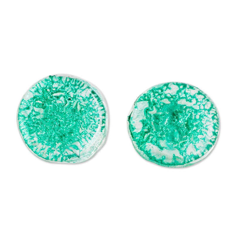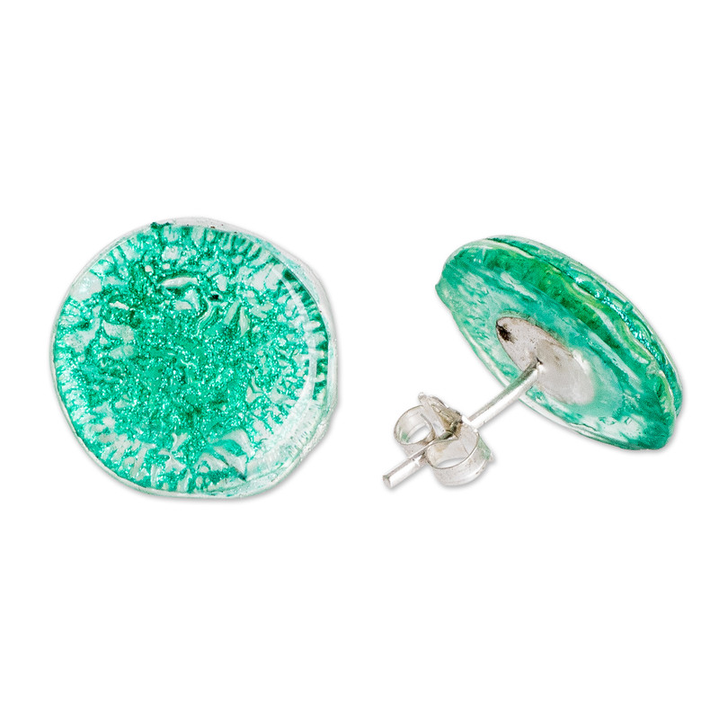 With a resolute dedication to environmental responsibility, Guatemalan artisan Rosario Leiva handcrafts these eco-conscious stud earrings poised to infuse your look with elegance and sophistication. Meticulously fashioned from recycled CDs, these stunning accessories are hand-painted with a captivating emerald hue, boasting lovely bubble patterns and elegantly adorned with sterling silver posts.