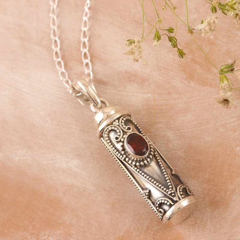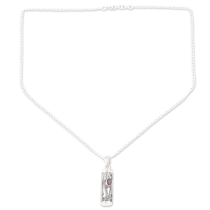 Backed by our Happiness GuaranteeEncrusted with a single garnet, the vial on Rakesh Rana's pendant necklace is suitable for your favorite scents and perfumes. The Indian artisan uses sterling silver to hand craft the vial, which unscrews at the top, swinging from a sleek Cuban link chain.