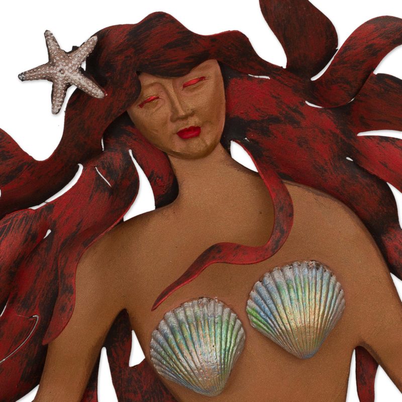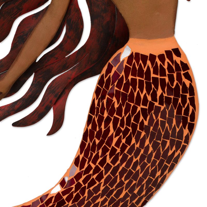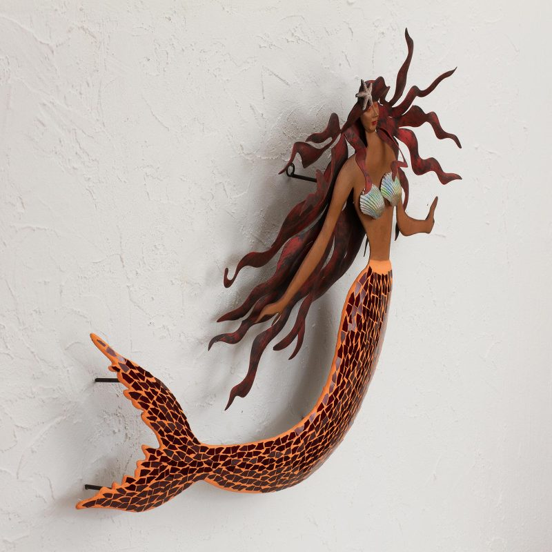 Wearing a starfish in her hair, a beautiful mermaid sings of the sea. Mexican artisan J. Blas cuts and shapes the image by hand, adding details in glass mosaic.
