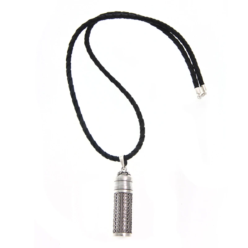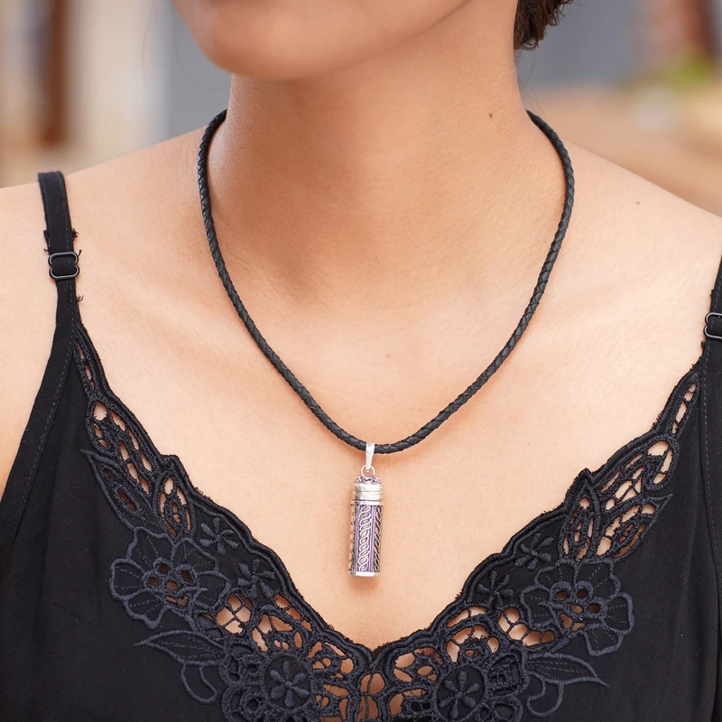 Ancient Balinese beliefs and customs inspire this necklace from Kadek Wijayana. The locket pendant recalls those once worn to keep lucky amulets inside. Handcrafted of sterling silver, the locket hangs from a braided leather cord. It opens by unscrewing the top.