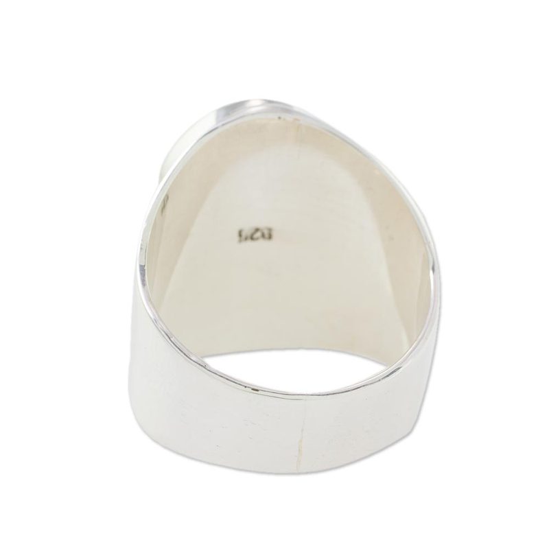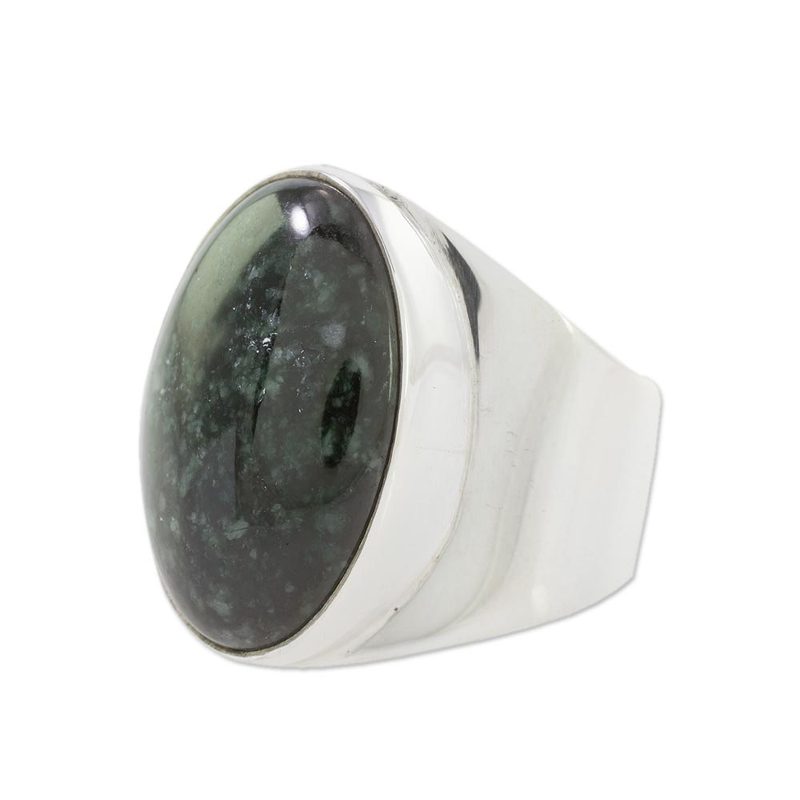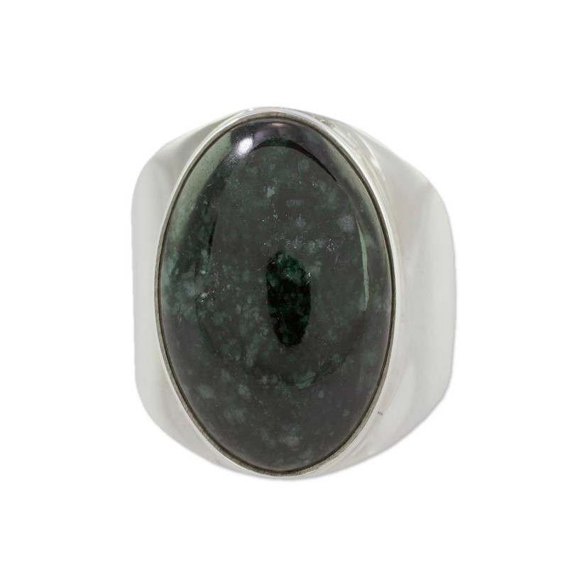 Centered by a bold oval stone of dark green Guatemalan jade, this men's ring adds flair to any outfit. The band is crafted of sterling silver with an outstanding high-polish finish, sure to draw attention wherever it goes.