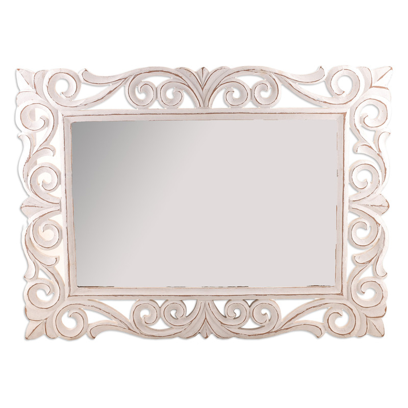 This splendid white wood mirror with a shabby-chic distressed finish can be displayed either on a wall or tabletop. It is expertly painted and carved by hand from mango wood with exquisite vine motifs and openwork accents. Presented by India's Khalid Ali, the fabulous mirror features a stand on the back, allowing you to place it on any surface, and an iron hook for hanging on a wall.