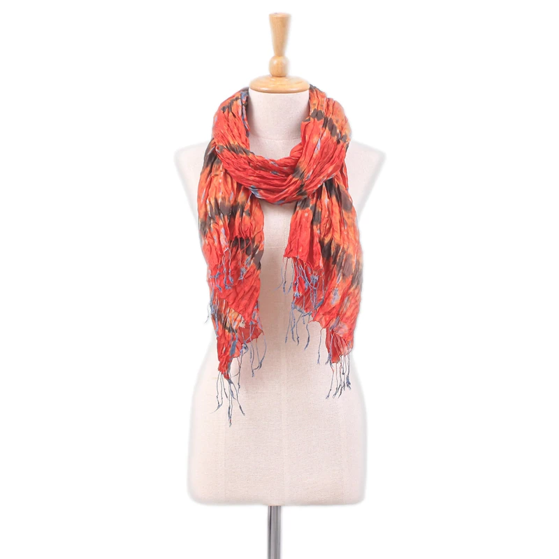 Backed by our 100% Happiness GuaranteeTie-dye techniques allow this fabulous garment to enhance your bold side. Crafted in Thailand by Vinita, this silk scarf features a gorgeous pattern of orange and red hues, accented with fringes that complement the accessory's charming drape.