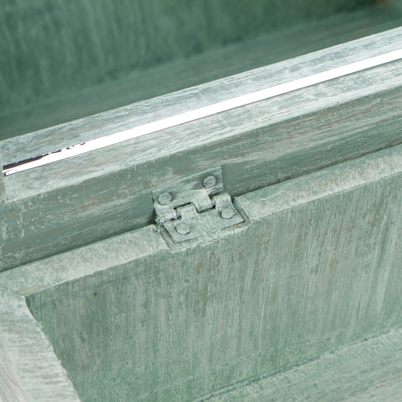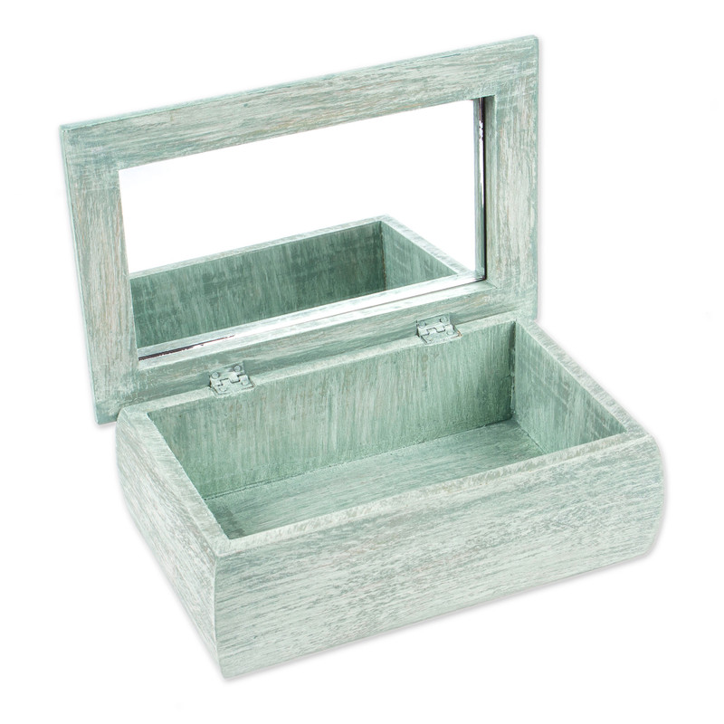 The classic Catrina goes for a walk with her beloved dog in the decoupage print that decorates this classic jewelry box by Ana Maria Gonzalez of Mexico. Sturdy pinewood composes the box's structure, spreading a serene mint hue. A mirror decorates the interior, whereas floral details complete the lid's image.