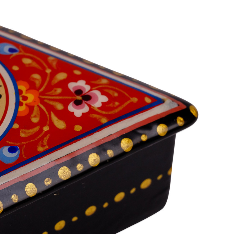 Representing the harmonious union between divine, spiritual and human forces, a triangle gives inspiration to Uzbekistani artisan Hojiakbar Vohidov to craft this sublime papier mache jewelry box ornamented with the region's traditional details. Enriched with a palette of red and golden hues, the accessory has a round floral motif on the lid and a faux velvet-lined interior for a luxurious aura.