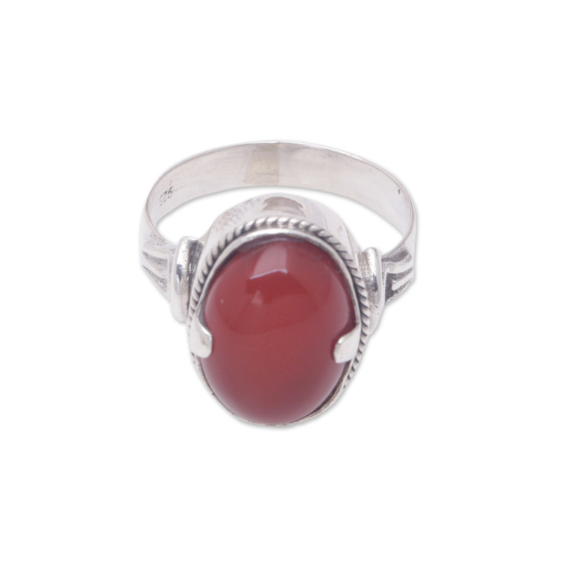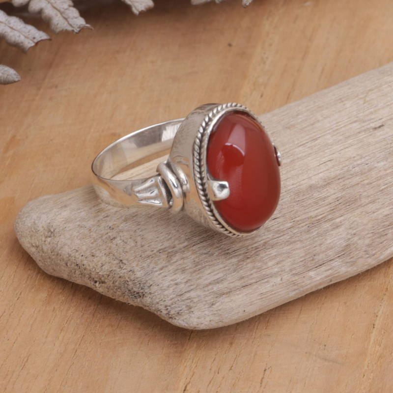 Twin prongs clasp a fiery carnelian, which represents July´s birthstone, in a silver embrace. Bright as a dragon's eye, the gemstone centers a ring by Wayan Sarjana. Carnelian is believed to inspire action, movement, eloquence and courage; it fosters feelings of well-being.