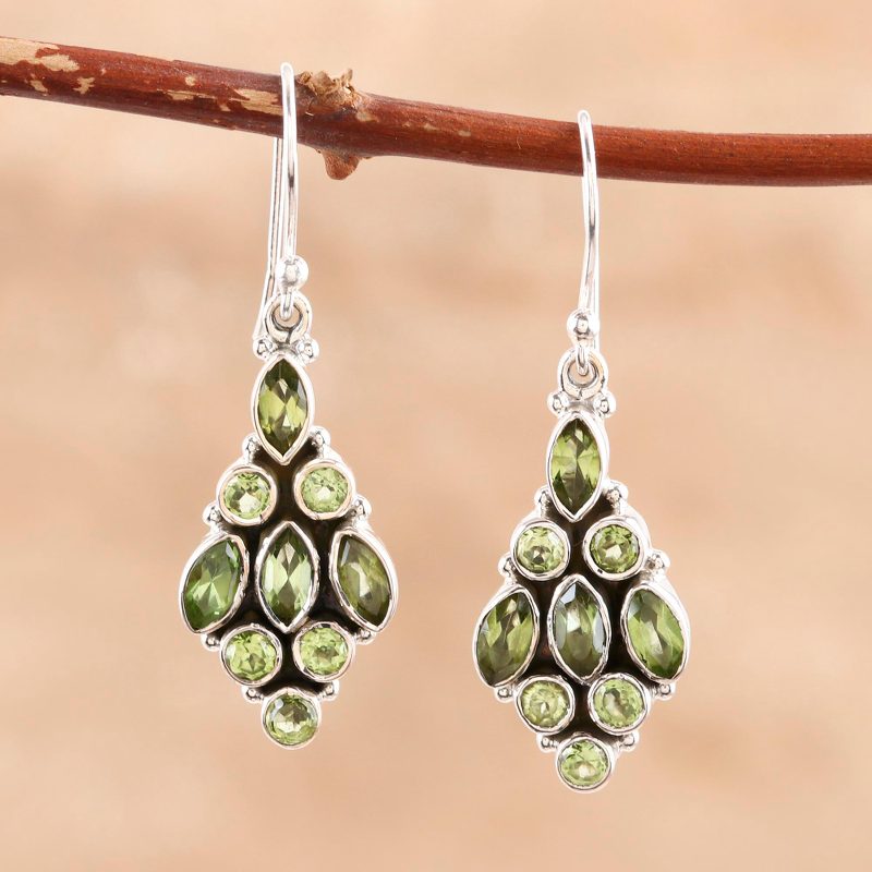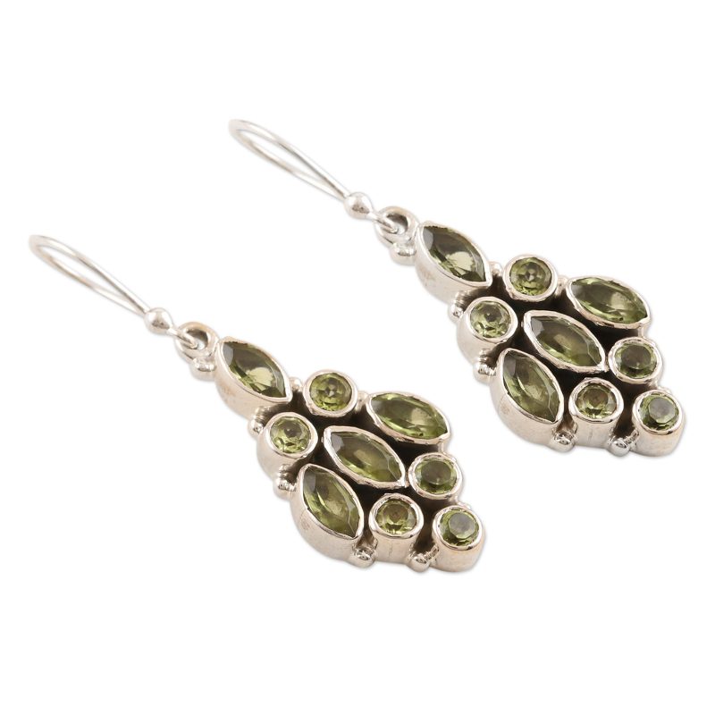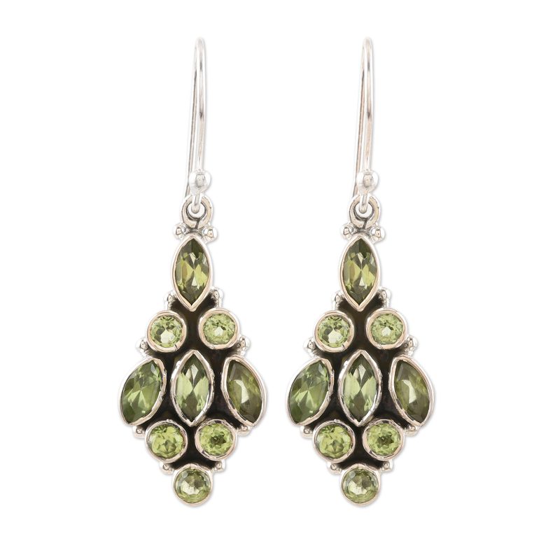 Release resentment and neutralize negative energy with the power of pale green peridot. Indian artisan Alok Jain uses faceted peridot gems in round and marquise shapes to create a tower of sparkling gems, which swing prettily from shining sterling silver hooks.