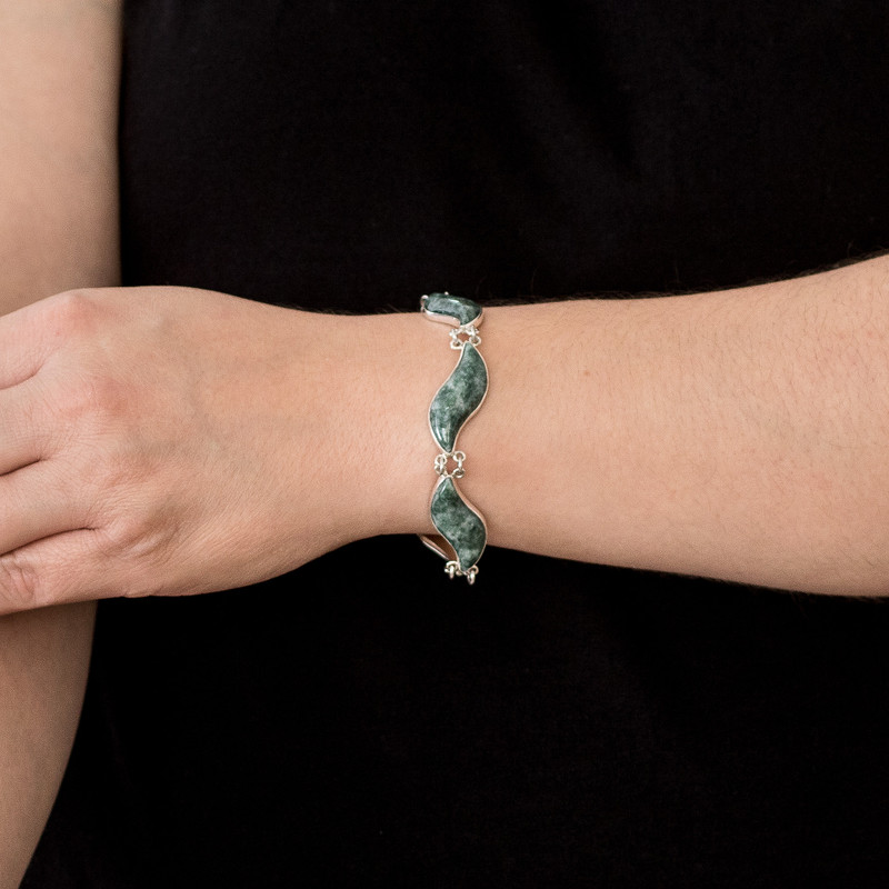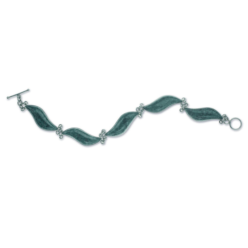 Set in sterling silver, green jade leaves undulate in the Guatemalan breeze. Zandra Lorena Sajbin creates a beautiful bracelet to celebrate the endless beauty of the verdant gem, sacred to the ancient Maya.