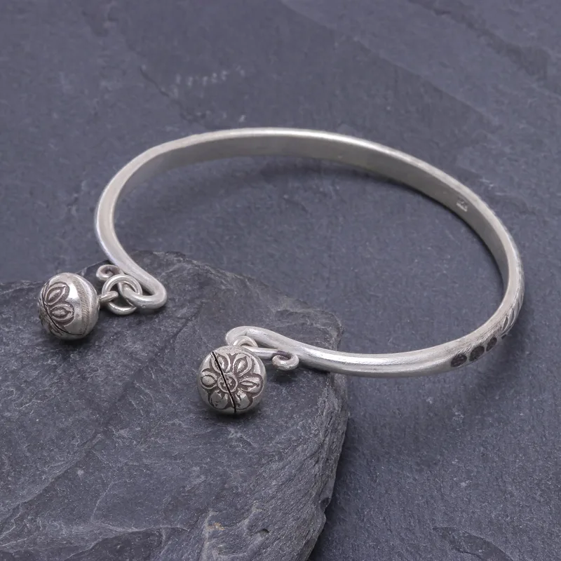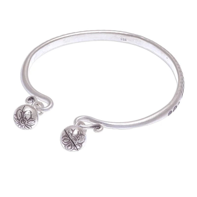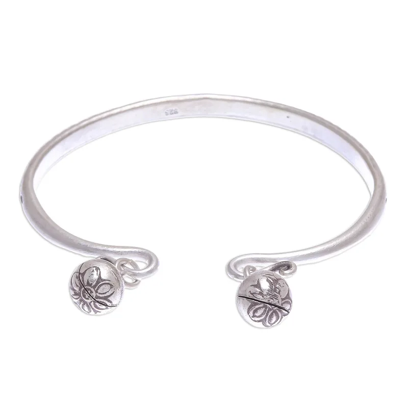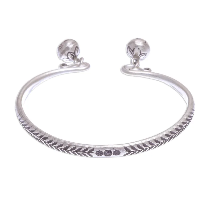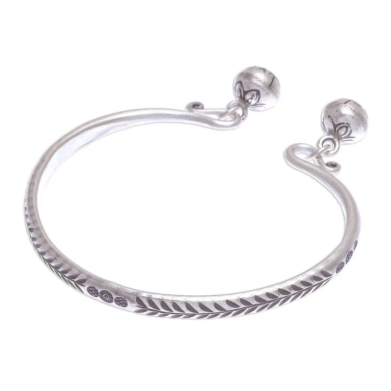 Create some noise with this fascinating cuff bracelet from Thailand's Pakaon Sojintarit. Hand crafted from 925 sterling silver, the bracelet features a stamped leaf motif in an oxidized finish. The artisan finishes the bracelet with a flower-stamped ringing bell at either end.