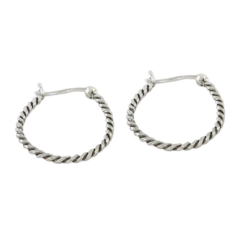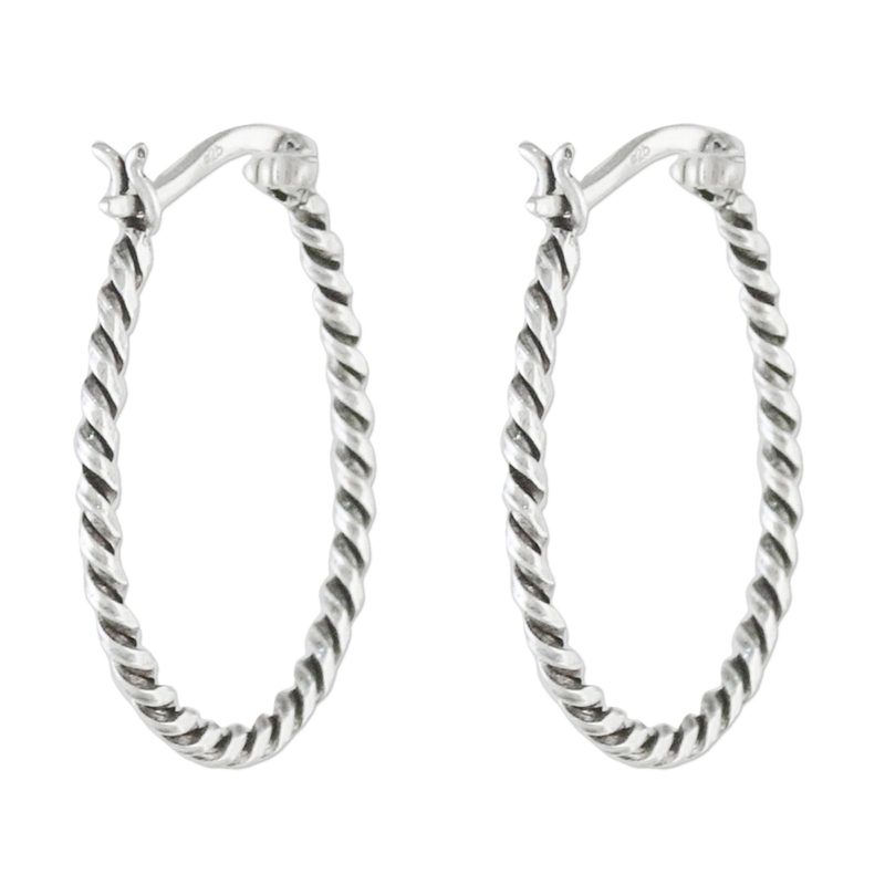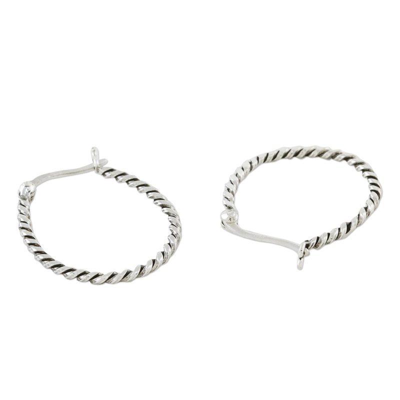Lalana adds a twist to the classic design by literally twisting sterling silver into a stylish set of hoop earrings. Closing with a saddleback clasp, the earrings are given an oxidized finish that accentuates the twirl of the metal.