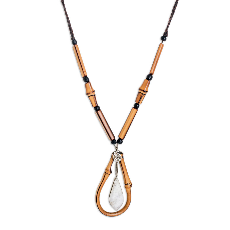 Backed by our 100% Happiness GuaranteeCosta Rica's Bernardo Villalta works with bamboo to make the bars and oval frame that decorate this pendant necklace of unique appeal. But bamboo shares the starring role with another key component: a stunning white jade pendant that is the focal point of this gorgeous necklace featuring an adjustable cord, pinewood beads and swirl and spring accents made of twisted stainless steel wire.