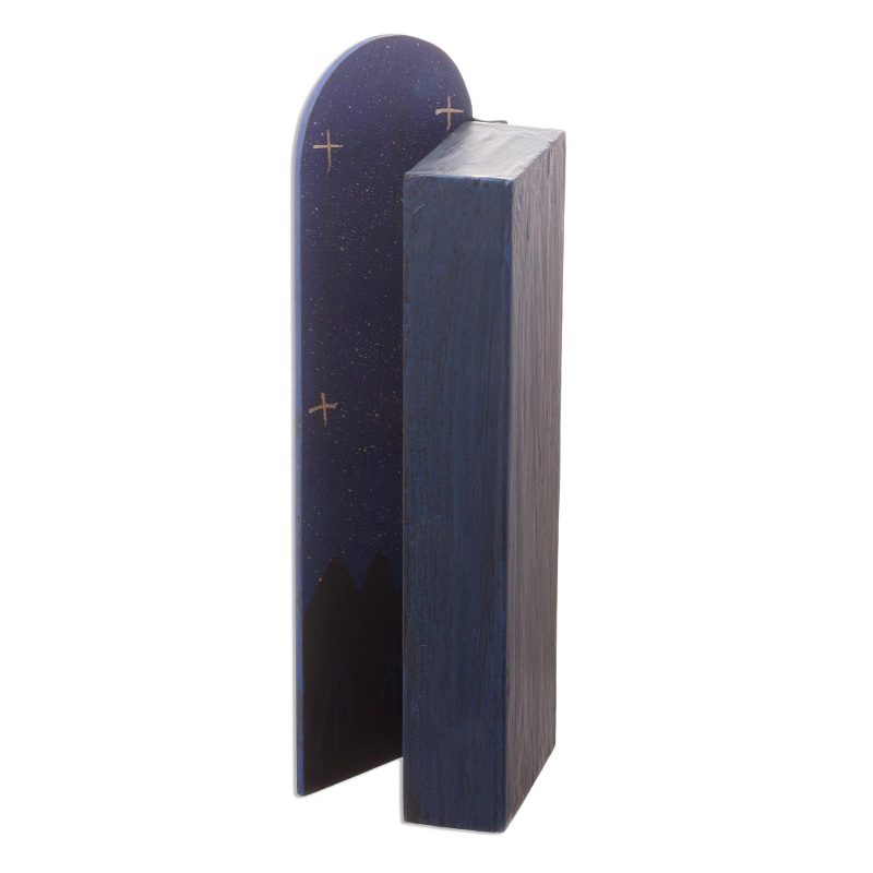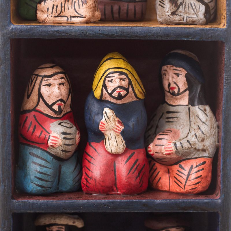 Backed by our 100% Happiness GuaranteeWatching over their tiny son, Mary and Joseph smile. Above them, the three kings bring offerings to the Christ child. Shepherds worship and angels sing in the heavens above. Alejandro Chávez portrays the nativity on four levels in three dimensions. This traditional diorama is known as a retablo; each figurine is modeled and painted by hand.