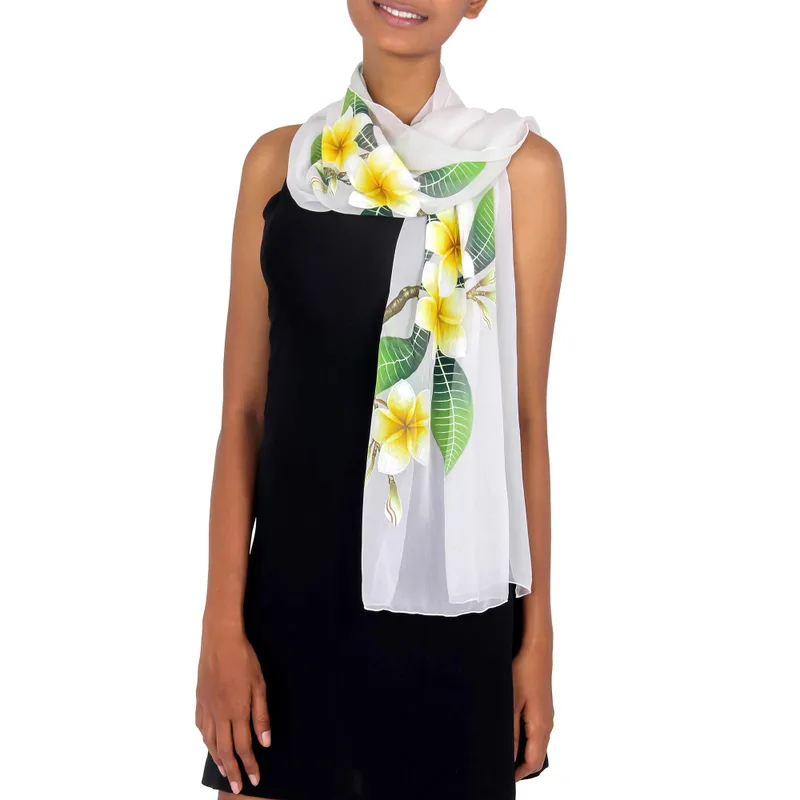 Blooming on an expanse of sheer white silk, golden jepun, or frangipani flowers, whisper of Bali. Designed by Dewa De Wardana, this exquisite lightweight shawl is painted by hand and signed. Slight variations are to be expected, as each one is individually handcrafted and therefore unique.