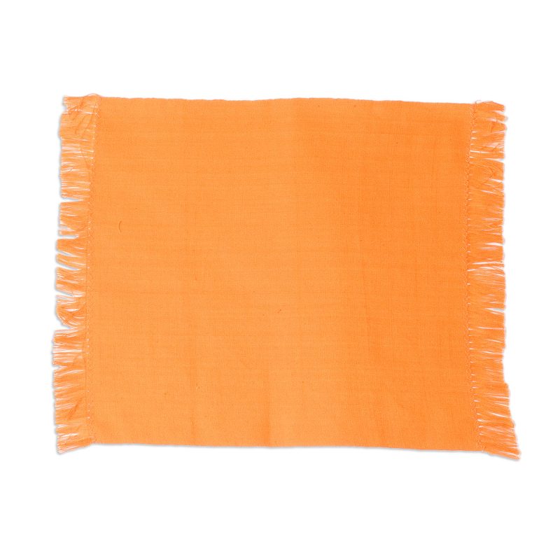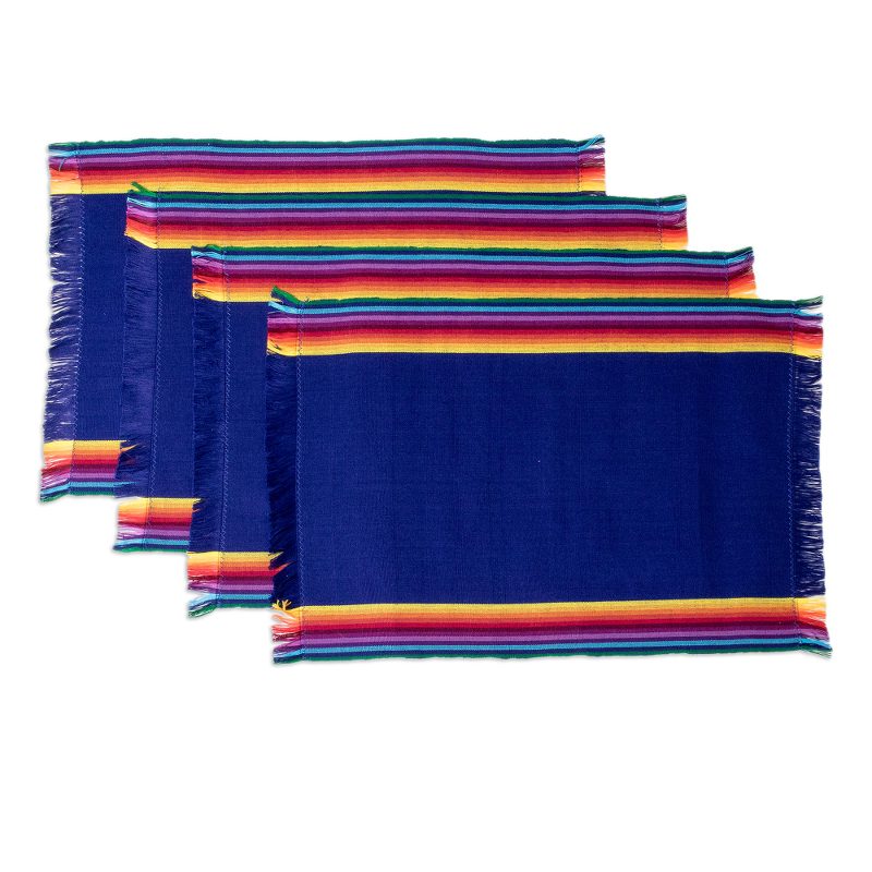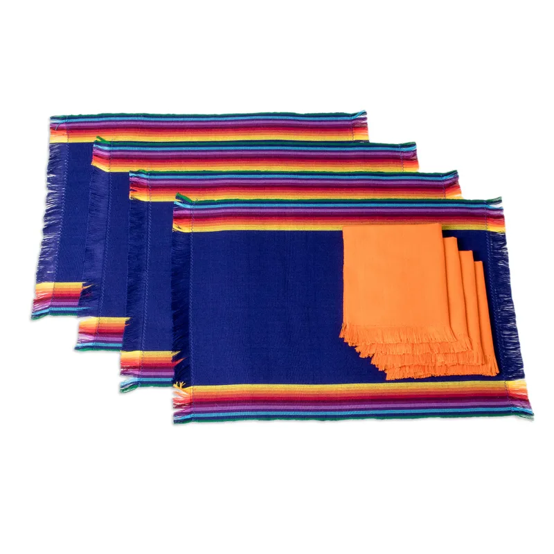 Guatemala's San Antonio Palopó Cooperative presents a charming cotton creation ready to add a vibrant touch to your dining room. These four placemats come in an indigo tone with colorful stripes embellishing the designs. In addition, four orange napkins bring a cheerful accent to the set.