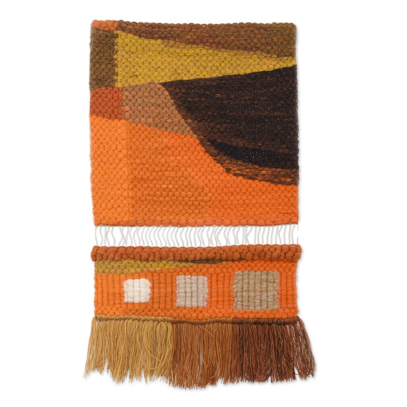 Backed by our 100% Happiness GuaranteeInspired by the beauty of the Andean Mountains, Peru's Luis Leon creates a truly artistic tapestry. He works on a traditional loom with wool, utilizing a technique known as llenado to hand-weave this tapestry. A square showcases abstract shapes in earth and green tones, while white threads connect it to a dangling portion with square patterns and a fringe.