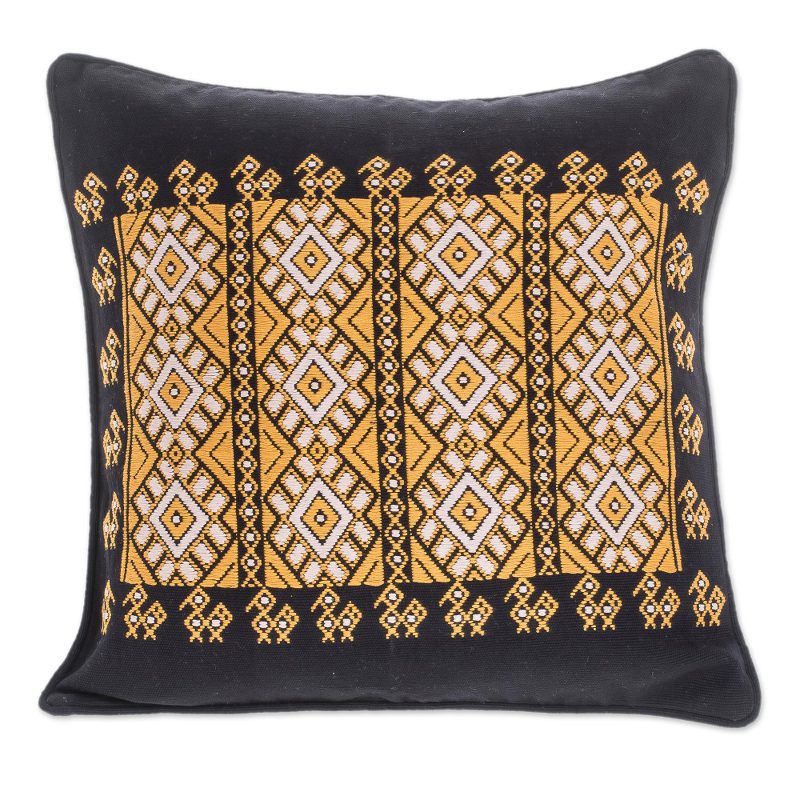 Presented by Guatemala's Women United for Artisan Development, this cushion cover makes an elegant addition to any space. Local artisans hand-weave this cover of cotton to feature geometric patterns in honey and ivory over a body in solid black. On the back, this cover opens with a zipper for inserting a cushion.