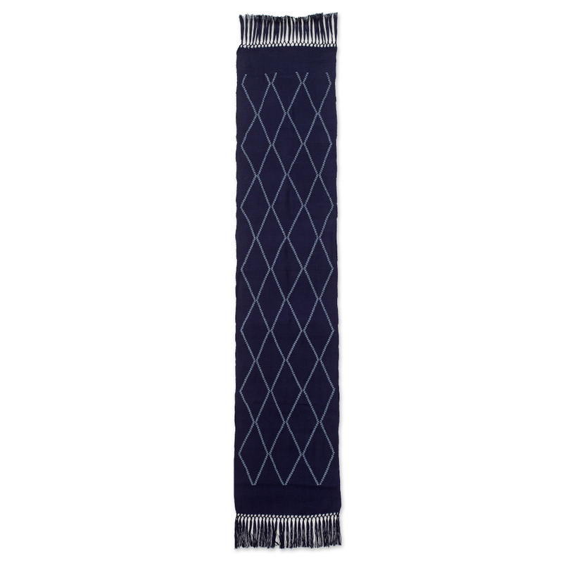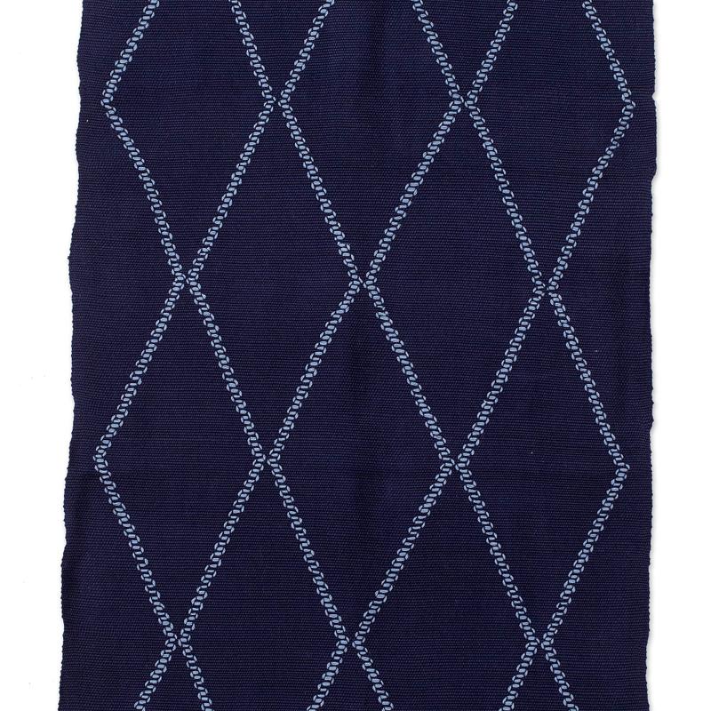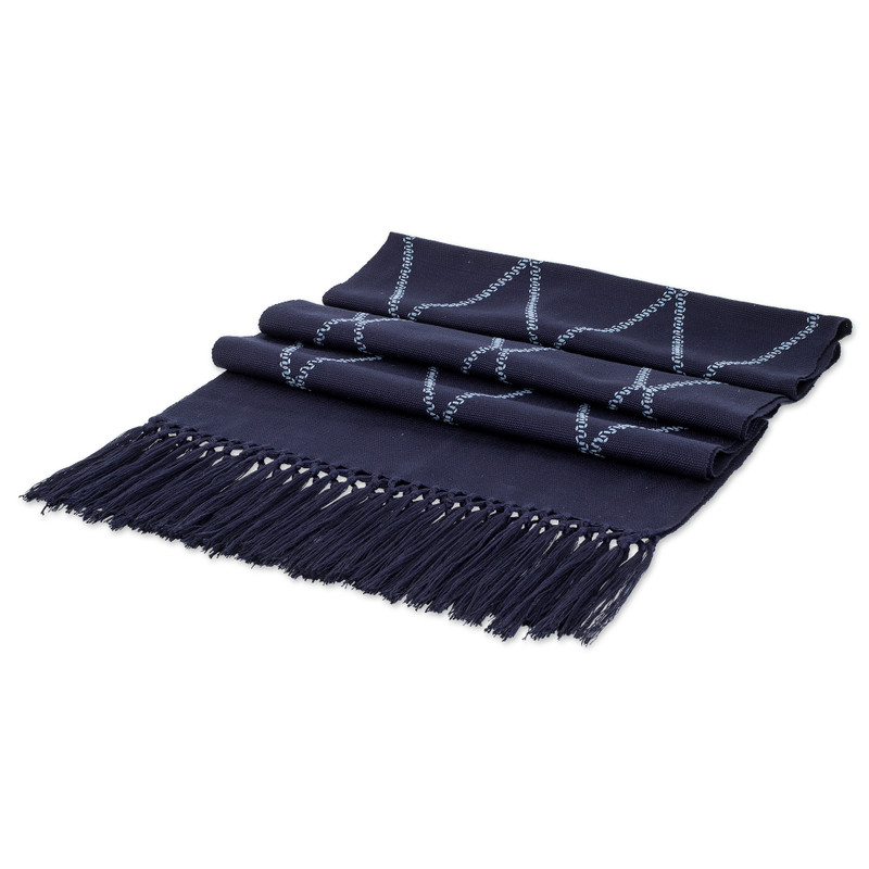 Add timeless style to your table with this dapper handwoven cotton runner from Guatemalan artisans Miriam and Debora. Its refined navy background hosts intricate sky-blue diamond patterns, exuding peaceful sensations. Fringes trimm both ends to provide an extra pleasant look. Woven on a traditional loom, this enchanting accent also captures the beauty of the region's traditional textiles.