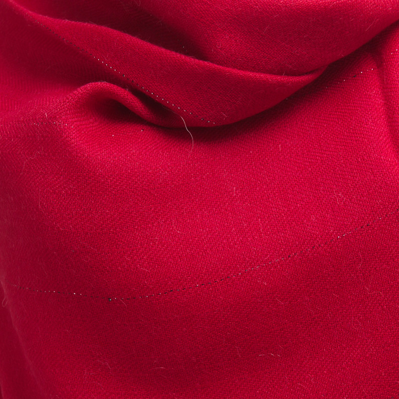Woven by hand, this scintillating shawl features delicate strands of silver that bring sparkle to the design. Raquel and Gregor work on a traditional loom to weave the wrap by hand. A blend of luxurious baby alpaca, soft pima cotton and nylon accents form a subtle herringbone motif along the length of the deep red shawl.