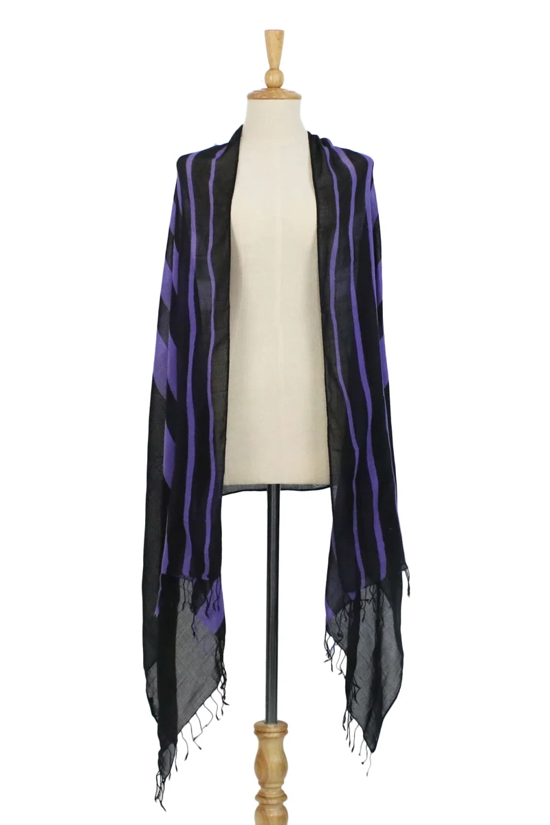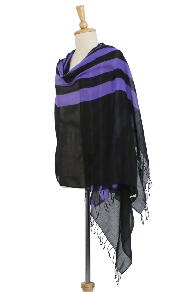 Featuring cool stripes of violet and black, this fascinating shawl from Thailand is handwoven entirely of cotton. The breezy and lightweight accessory is created by Vinita, who uses a lifetime of experience to inform her designs. She finishes it with dangling fringes at each end.