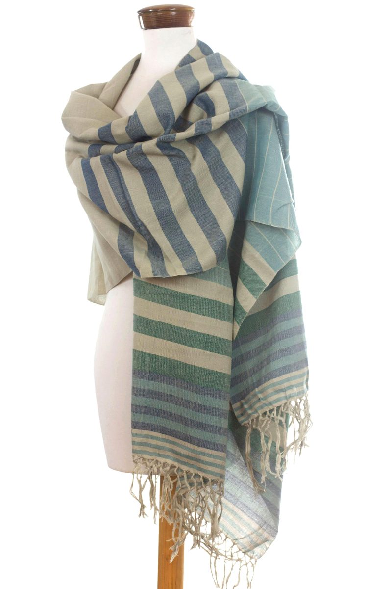 Yama Aj Chixot Artisan Group proudly preserves Guatemala's textile tradition with the modern design of this shawl. They work on the pedal loom, which requires a laborious process to prepare the loom for the striped patterns. This lightweight cotton shawl is woven in shades of blue, green and aqua underscored by pastel olive green.