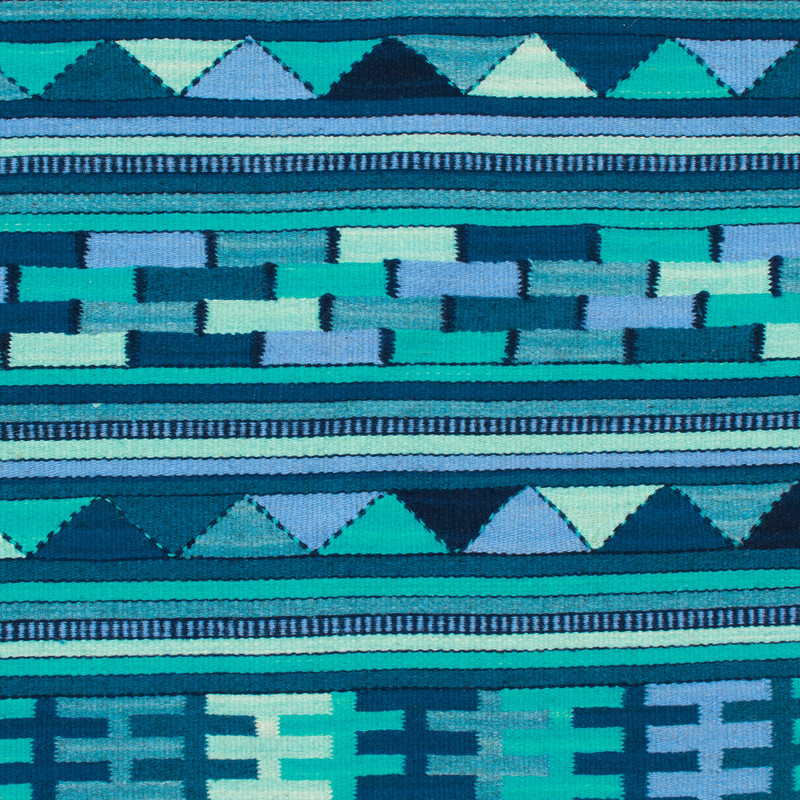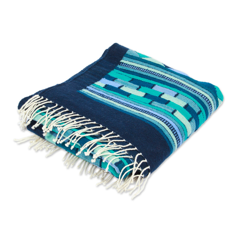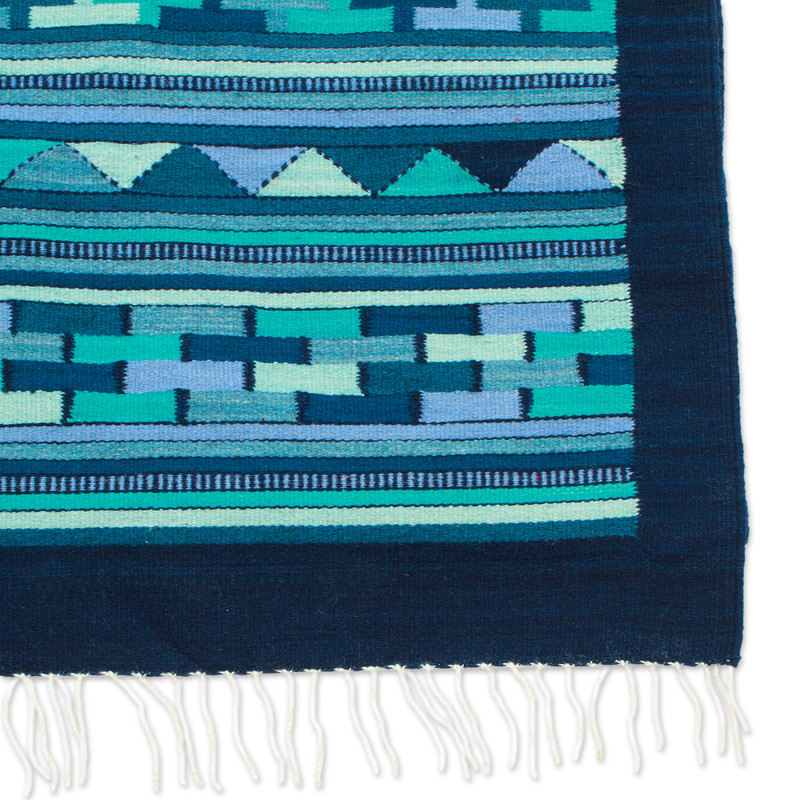 Bring charm, vibrancy and a contemporary touch to your surroundings with this breathtaking bordered runner rug, featuring mesmerizing geometric patterns as the main attraction. Skillfully hand-loomed from wool tinted with all-natural dyes, it showcases an elegant color palette in shades of blue, turquoise and green that immediately commands attention. Drawing inspiration from Mexico's Zapotec legacy, artisan Mario Chavez's exquisite design is completed with hand-knotted fringed details on the ends, ensuring a spellbinding addition to your home decor.