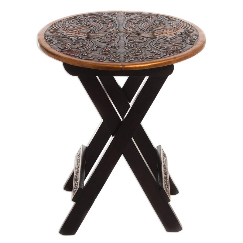With its novel folding shape, this accent table is beautiful and original. Abel Rios skillfully combines form and function, creating an unusual, handcrafted piece of furniture. The tabletop of polychrome leather is hand-tooled with elegant bird motifs. It is mounted on a frame of mohena wood, a fine Andean hardwood similar in grain to mahogany.