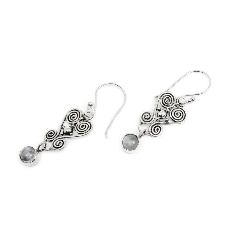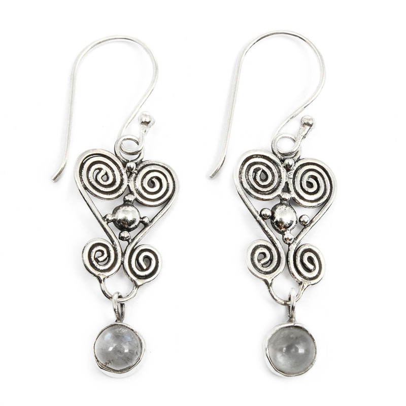 Spirals flow together in fanciful hearts to hang from sterling wires. These enchanting earrings by Nyoman Rena are set with flirty rainbow moonstone.