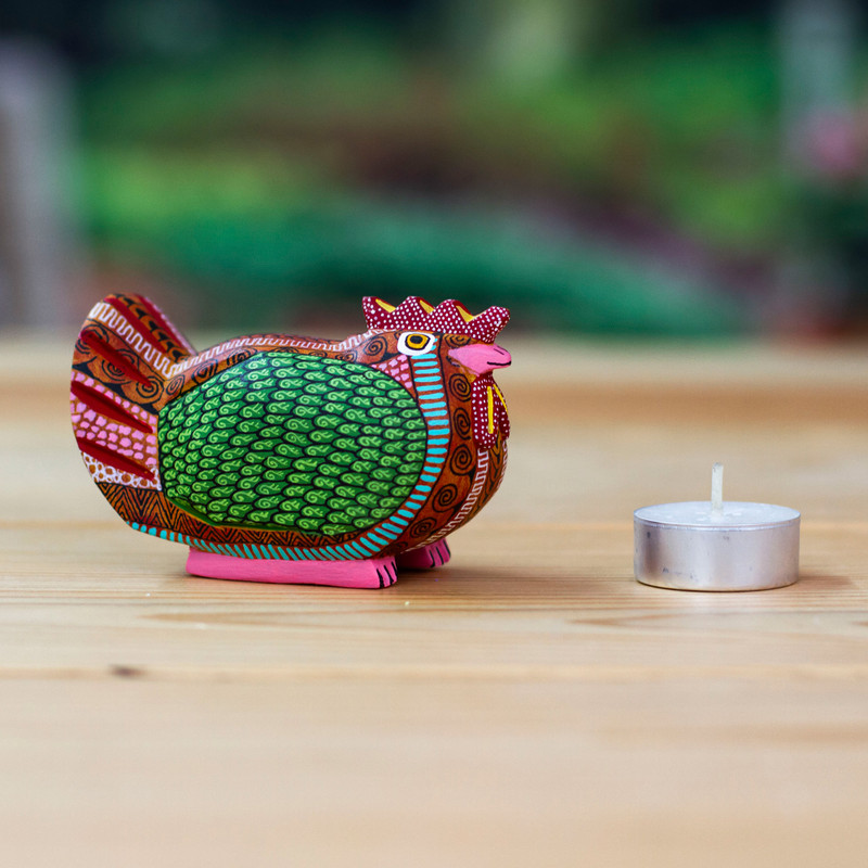 Backed by our 100% Happiness GuaranteeThis brightly colored hen is the work of Mexican artisans Jesus and Roxana Hernandez, who preserve the distinctly Oaxacan folk art form of alebrijes. The figurine is carved by hand from copal wood before being carefully painted with a dizzying array of colorful motifs.