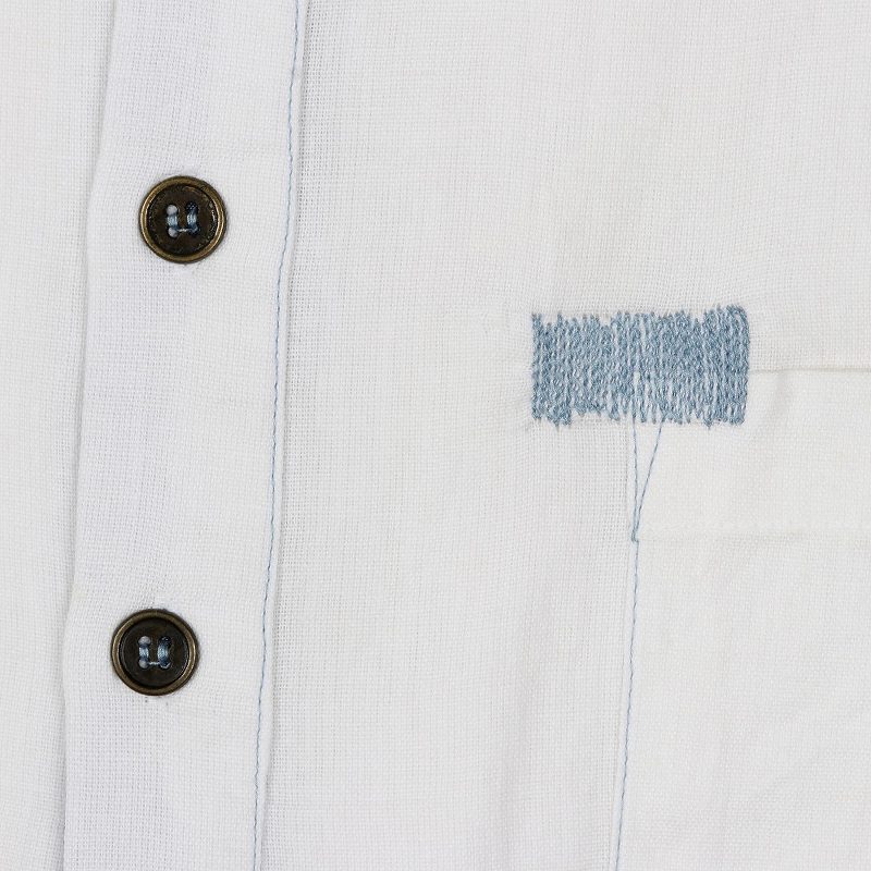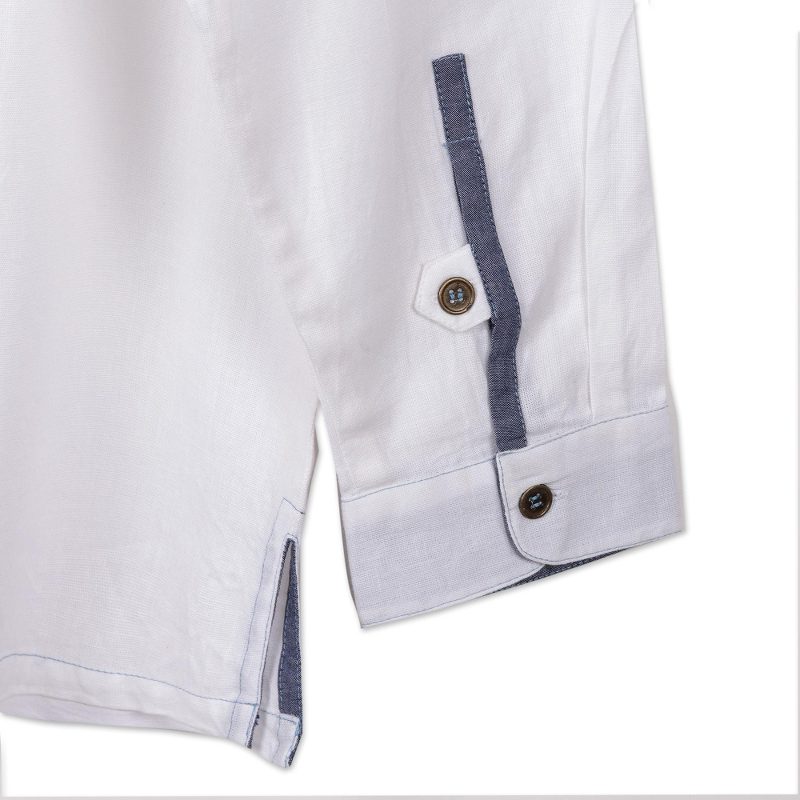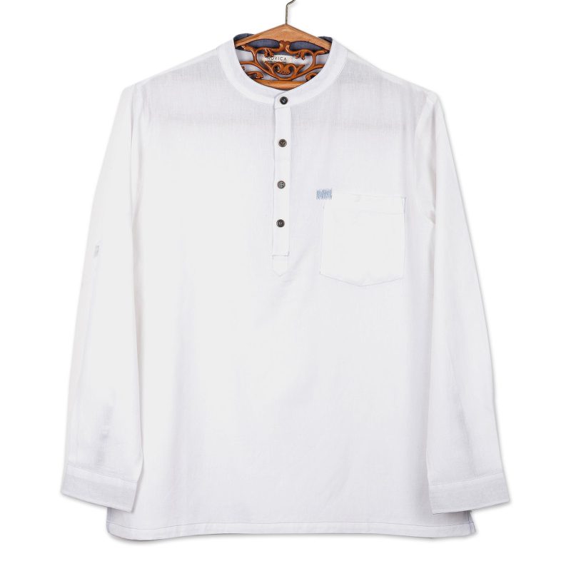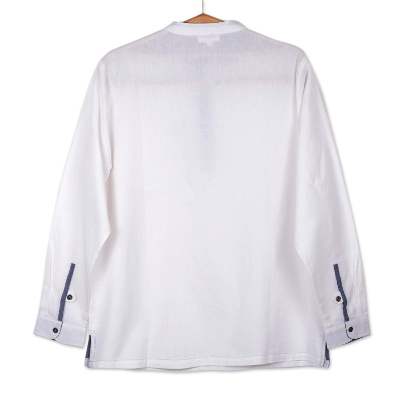 In solid white, a cotton and linen blend is used to create this casual men's shirt from India. Designed by Sandip Agarwal, this shirt features a button-up henley neckline and a left-side chest pocket. The button-up sleeves can be worn long or rolled up. Overstitching on the chest pocket adds a homespun touch.