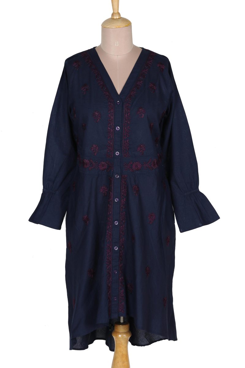 Maroon flowers bloom profusely on a background of navy blue in this pretty high-low shirtdress from designer Shalabh in India. Artisans craft the long-sleeved dress of 100% cotton, and cover the front with traditional chikankari embroidery blossoms. An embroidered button placket and waistline further accent the dress.