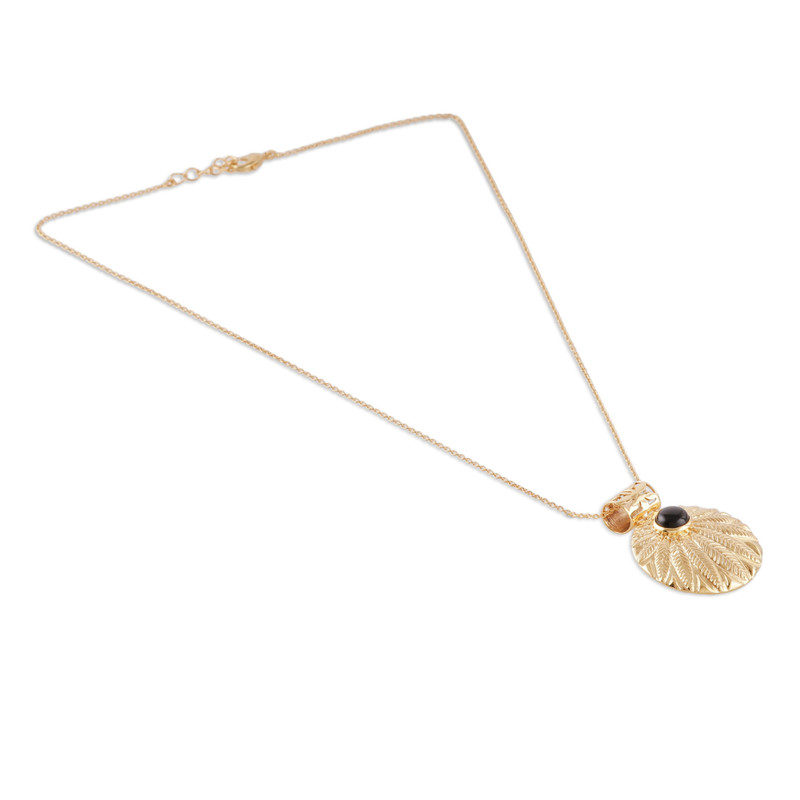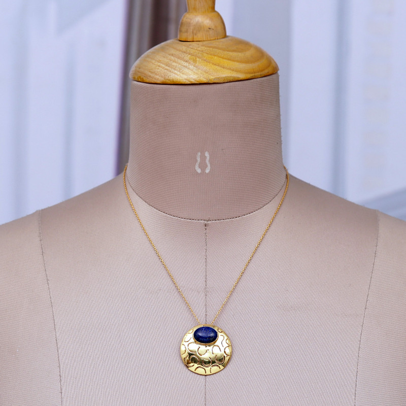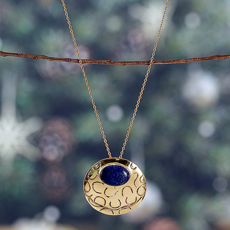 Backed by our 100% Happiness GuaranteeMade to exude avant-garde enchantment, Indian designer Ritu Malpani's newest brass necklace visits you with a message of wisdom. Inspired by modern trends, this radiant pendant necklace displays a sublime lapis lazuli gem, whose mystic blue hue attracts truth and intellect.