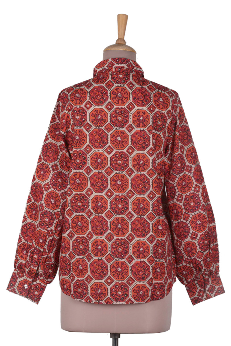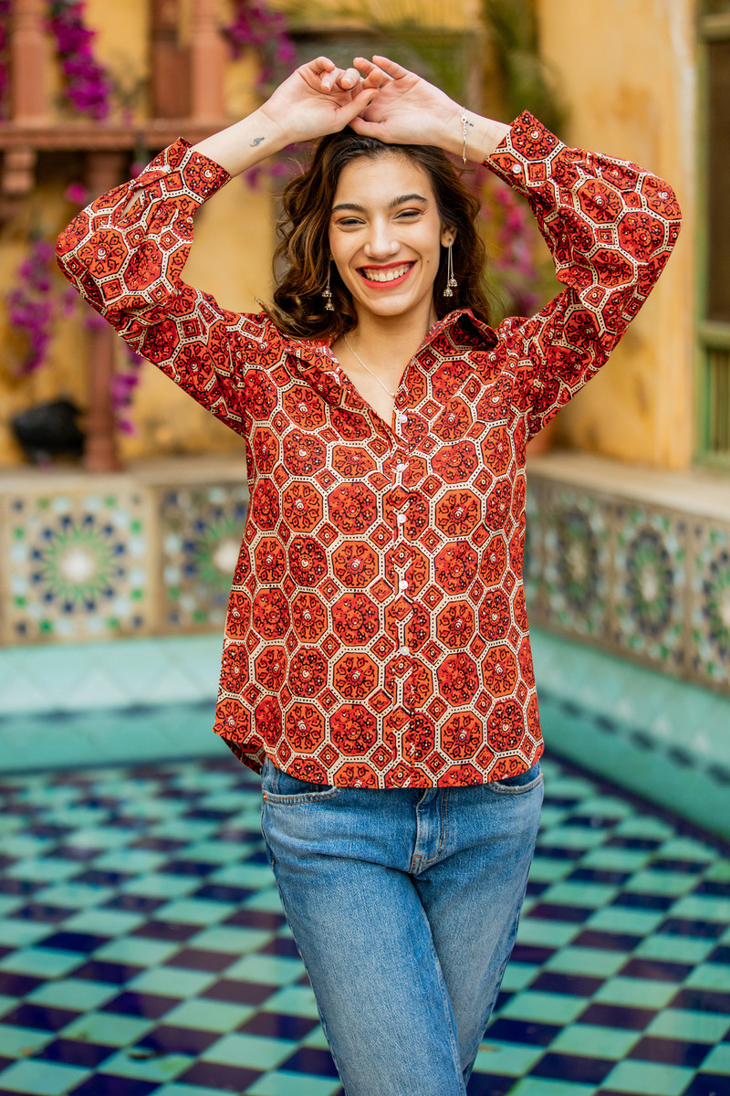Add fire to your wardrobe with this geometric printed shirt is shades of burnt orange and burgundy. Made by Seema Shah from Jaipur, India the hexagonal motifs are repeated across the collared cotton shirt, which boasts a slightly fuller sleeve at the cuff and button closure on the front and cuffs.